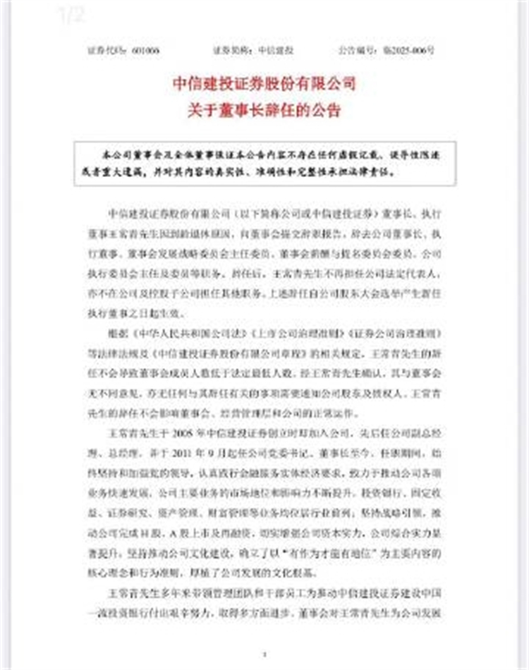 2月20日,中信建投證券發布公告稱,公司董事長、執行董事王常青因到齡退休原因,向董事會提交辭職報告,辭去公司董事長、執行董事、董事會發展戰略委員會主任委員、董事會薪酬與提名委員會委員、公司執行委員會主任及委員等職務。辭任後,王常青不再擔任公司法定代表人,亦不在公司及控股子公司擔任其他職務。上述辭任自公司股東大會選舉產生新任執行董事之日起生效。