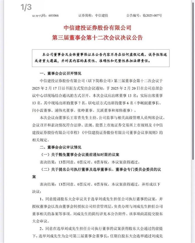 中信建投證券還發布公告稱,公司第三屆董事會第十二次會議於當日召開,同意在選舉劉成擔任公司執行董事的議案獲得股東大會通過的前提下,選舉劉成為公司第三屆董事會董事長,任期自股東大會選舉通過劉成擔任執行董事之日起至公司第三屆董事會任期結束之日止。劉成自正式履行董事長職責之日起擔任公司法定代表人。
