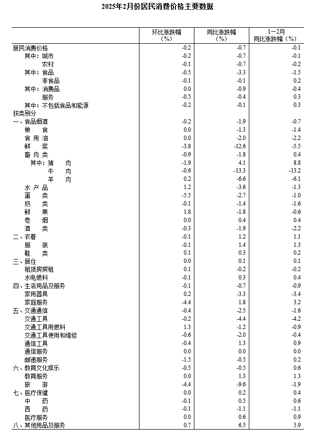 據國家統計局今日(3月9日)公布,2025年2月份,全國居民消費價格同比下降0.7%。其中,城市下降0.7%,農村下降0.7%;食品價格下降3.3%,非食品價格下降0.1%;消費品價格下降0.9%,服務價格下降0.4%。1—2月平均,全國居民消費價格比上年同期下降0.1%。