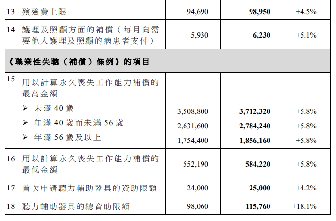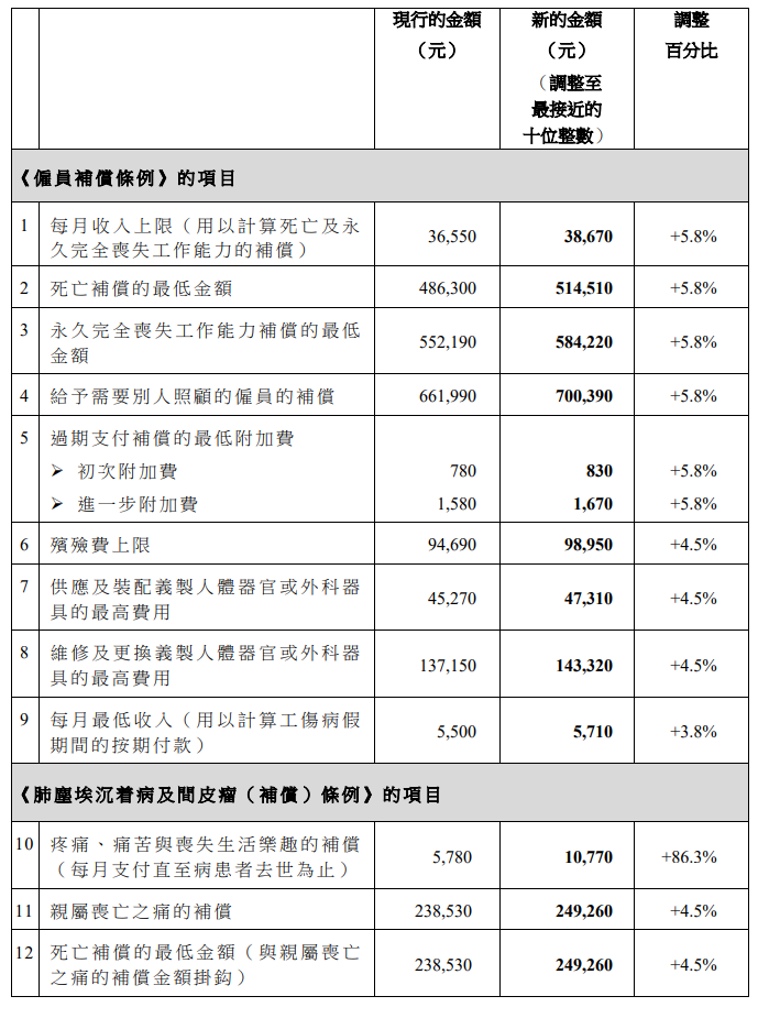 隨着今次調整,三條條例共18個補償項目的金額將會調高,增幅介乎3.8%至86.3%。