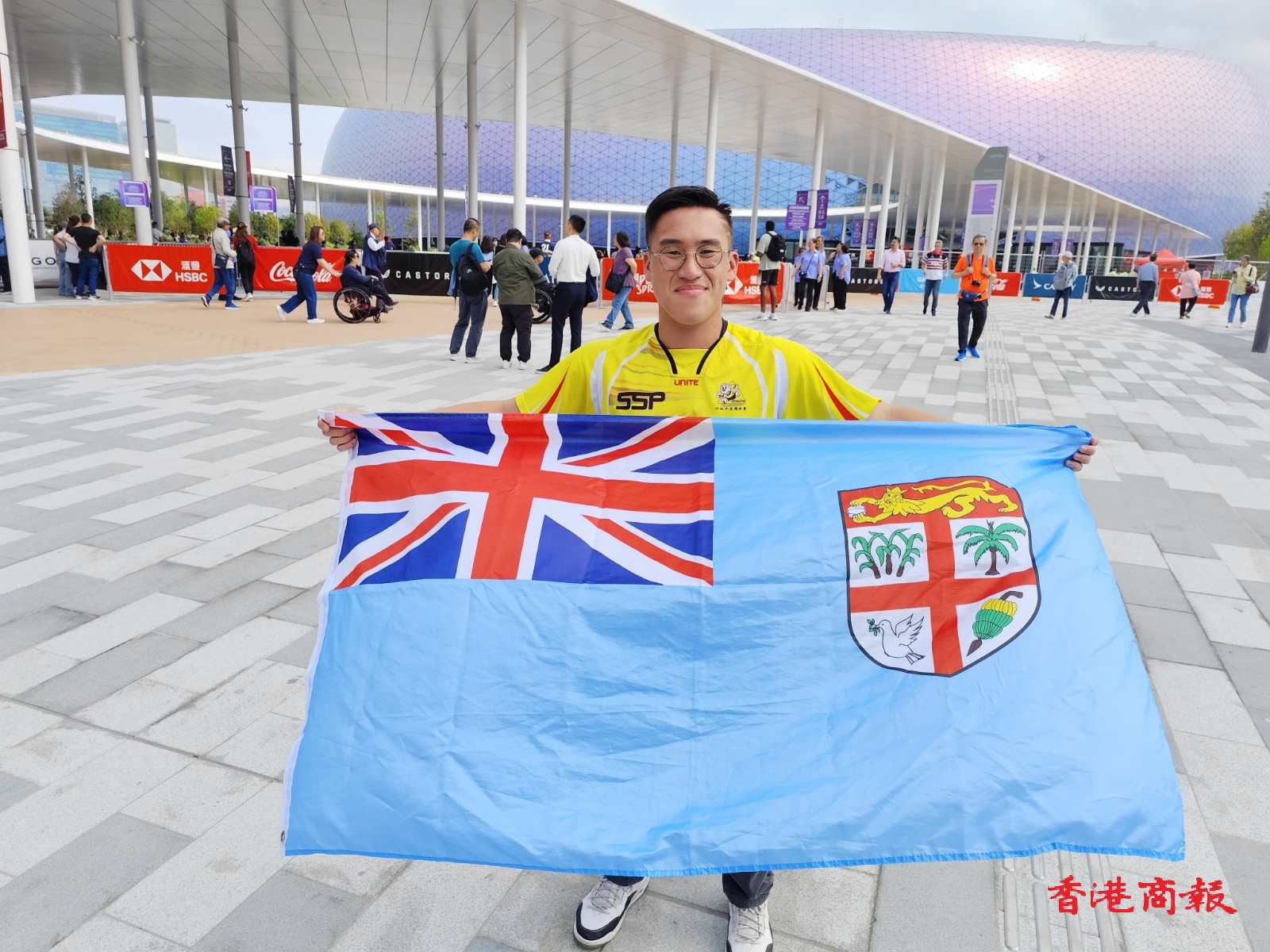 雷先生手持斐濟國旗進場,以10分為滿分,給予啟德場館8分。記者 馮瀚文攝