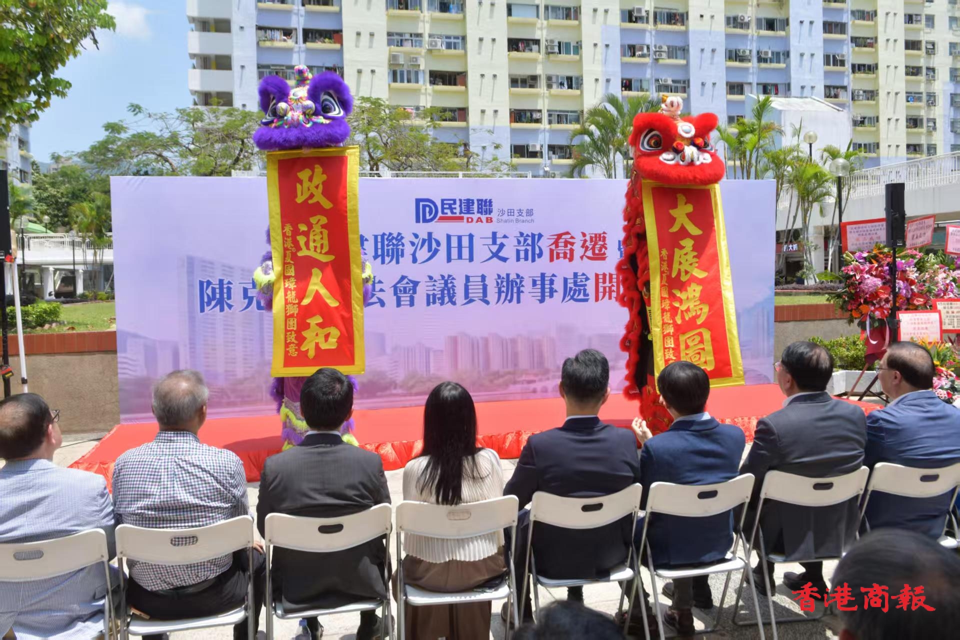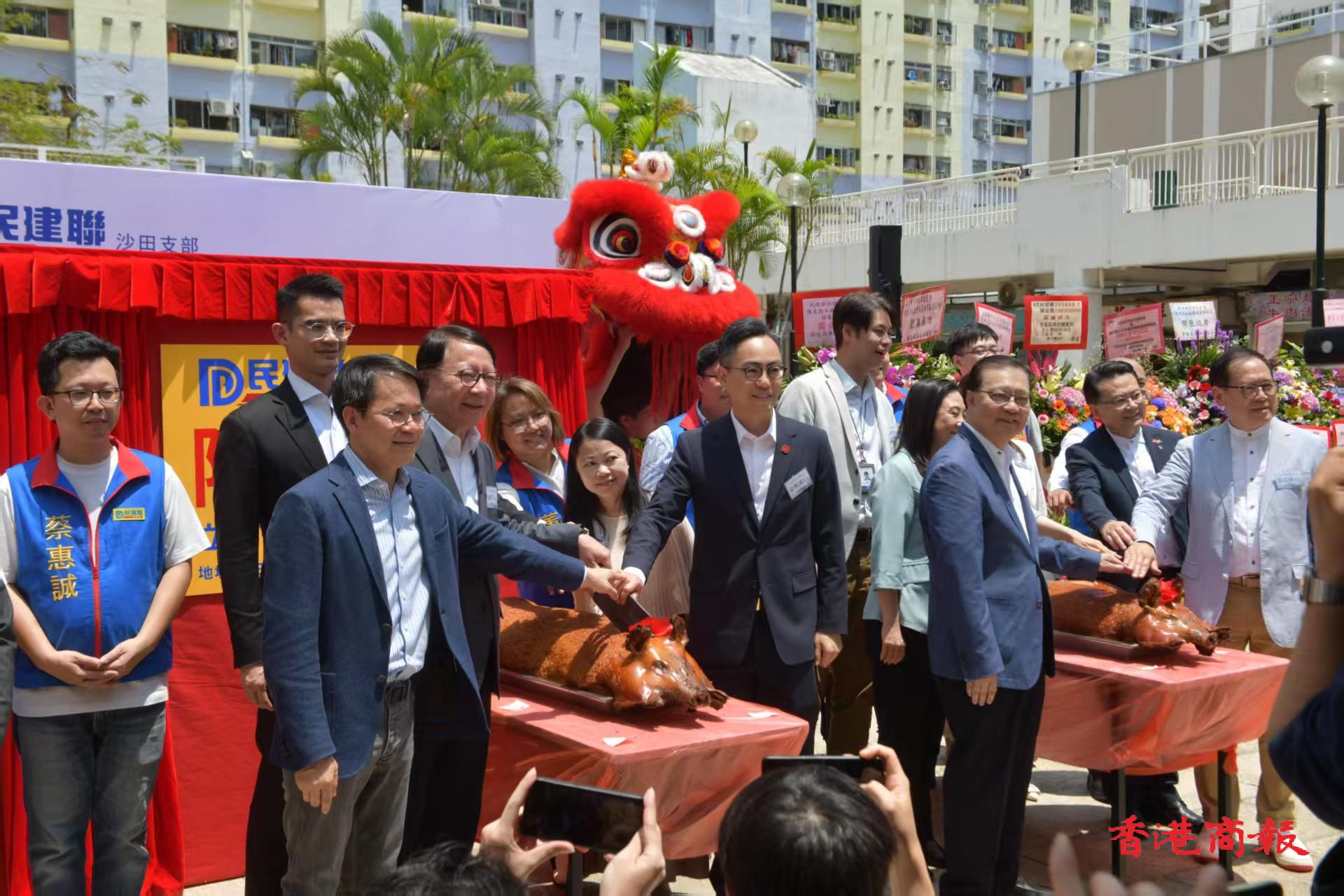 民建聯沙田支部喬遷暨陳克勤立法會議員辦事處開幕禮,今早(2日)在乙明邨中央廣場舉行,邀請政務司司長陳國基、身兼全國港澳研究會副會長的民建聯會務顧問譚耀宗,以及民建聯多位立法會議員出席。活動進行了醒獅表演以及切燒豬儀式,寓意好運常來以及政通人和。