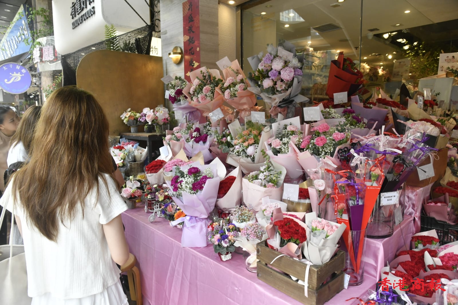 記者轉到太子花墟,見到人流比平時假日多出一倍,最多人買的是30至40元一小束的康乃馨,其次是約300元一大束配搭了玫瑰等其他的鮮花。「卉豐花業」負責人梁嘉兒表示,今年鮮花的來貨和零售價均無變,實體店的生意下跌了約2成,幸好他有300多張熟客訂單以及轉型網購,令今年生意和往年相若。另外,她也扭盡六壬促銷,加推連青花瓷花瓶的花束,又與蛋糕店和護膚品牌合作,加推連蛋糕或面膜的鮮花套餐。