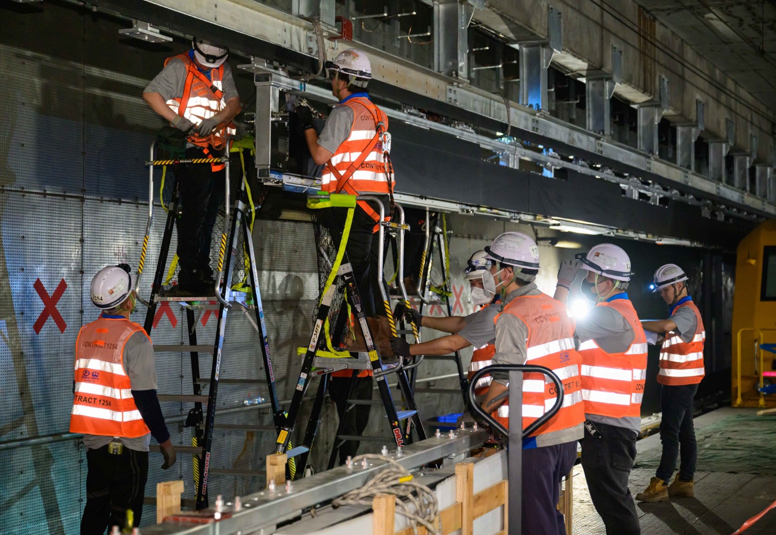 港鐵工程團隊在收車後為古洞站安裝玻璃幕牆及月台幕門。(港鐵fb圖片)