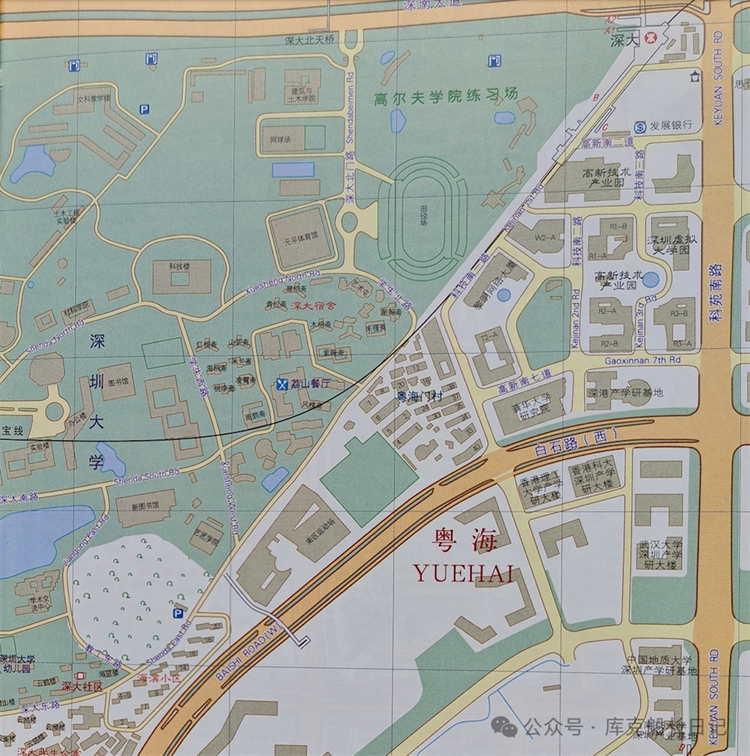 [嚴格地講,科技南一路是古代的岸線,白石路是當代(1970年代)的岸線。粵海街道,如它的名字,即是海,是由深大帶頭填出來的,並衍生出來的科技、生活盛世海岸家園。在新時期接着深大填出來的粵海街道高新科技聚集區,深大校友馬化騰的老樓在北,新樓在南。雄踞麻雀嶺的漢京中心俯視整個深大。]深鐵金融科技大廈恰在岬角終端下。旁是順豐科技總部(在深投控創智天地大廈)。中國儲能大廈(CES)顯赫。這就是1號線深大站C出口。車停深鐵金融科技大廈。停車費巨貴,一小時二十元。科苑路一路上坡到松坪山。