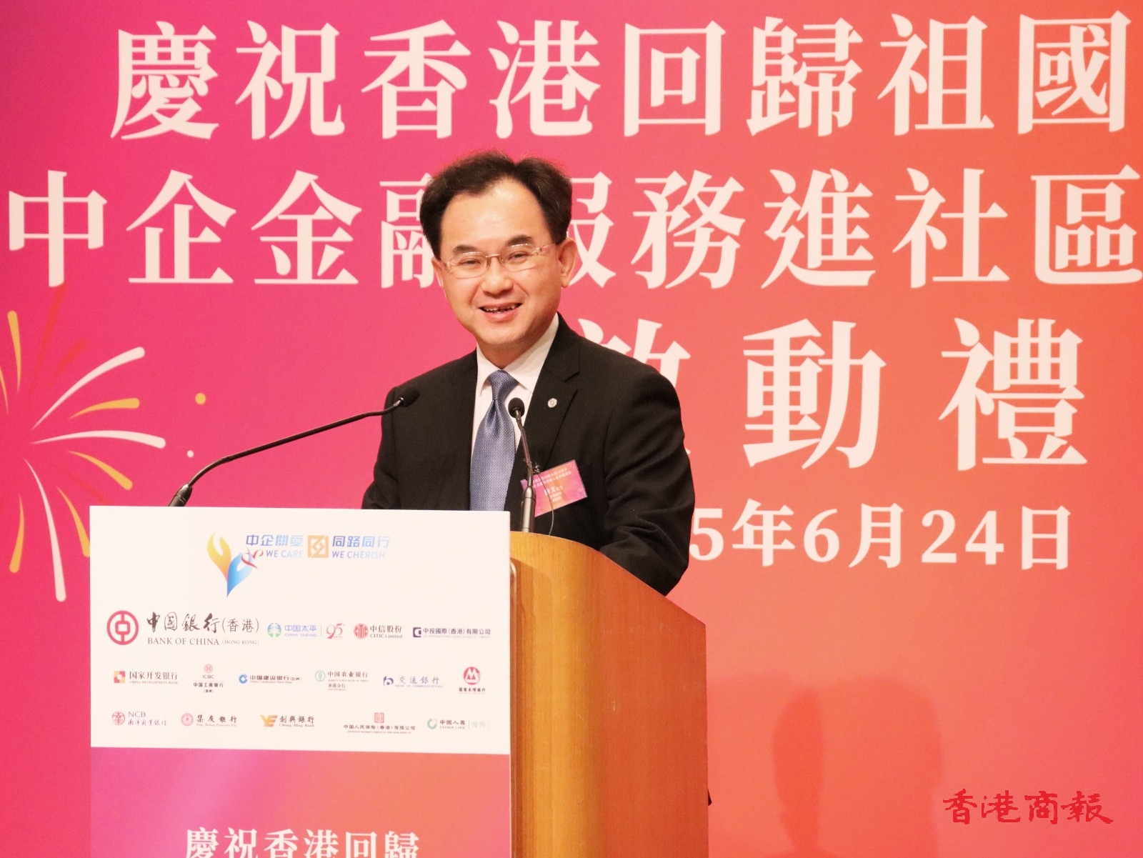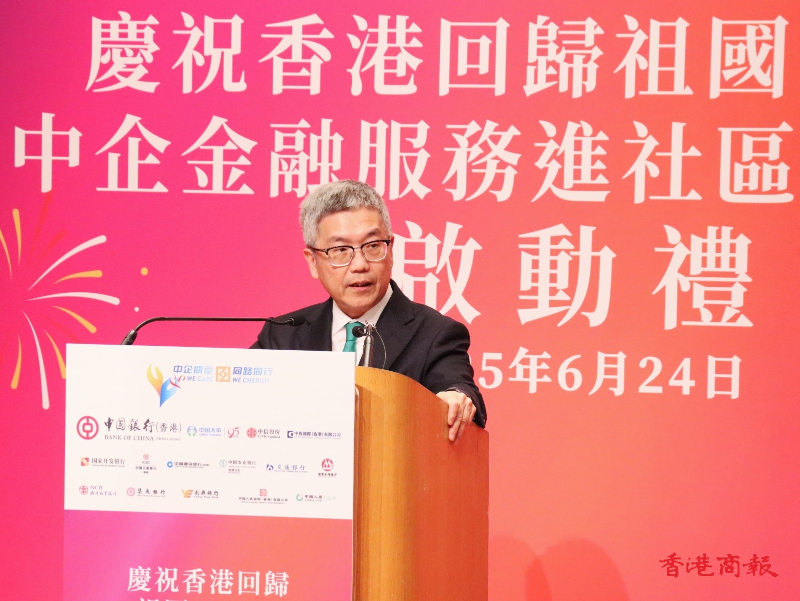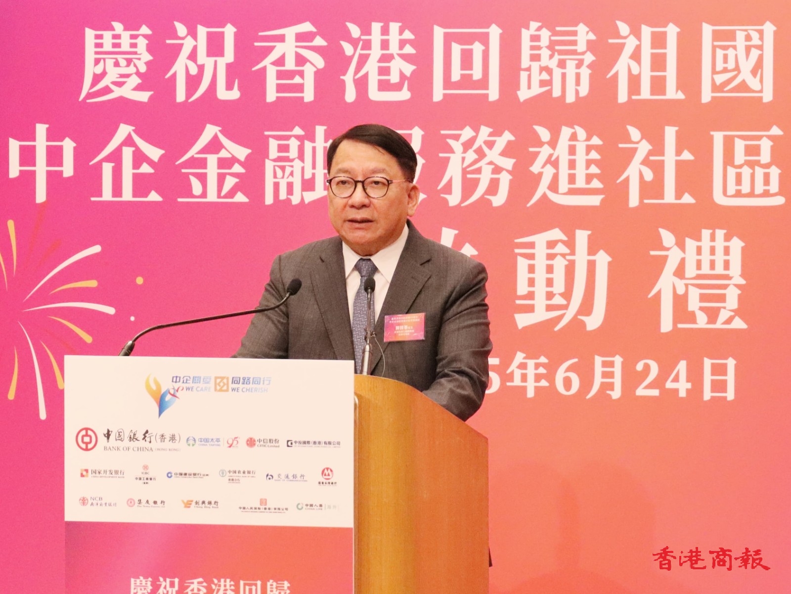 政務司司長陳國基在「慶回歸 中企金融服務進社區專題講座」啟動禮致辭。記者 馮瀚文攝