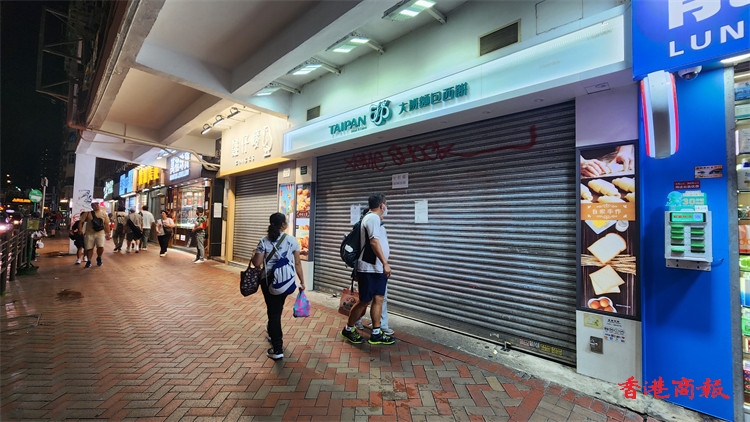 位於亞皆老街的大班麵包西餅旺角分店經已停業,鐵閘貼上停業通告,有路過市民停下圍觀。(記者何家驊 攝)