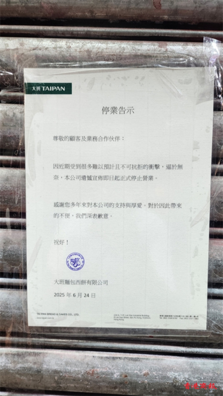 據大班麵包西餅的停業公告指,因近期受到很多難以預計,且不可抗拒的衝擊,逼於無奈,公司遺憾宣布即日起正式停止營業。對於因此帶來的不便深表歉意。感謝多年來對公司的支持與厚愛。對於因此帶來的不便,深表歉意。