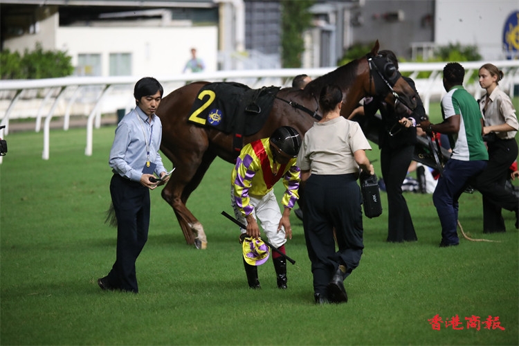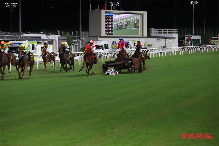 今晚(25日)跑馬地馬場舉行9場賽事,第五場三班1000米上演聖佐治挑戰盃,希威森主策昇廄「四季醒」捧成3倍大熱門,人馬出閘居中競跑,直路中檔全力衝刺,「四季醒」於最後75米突然失蹄倒下,希威森隨即落馬,而緊隨其後的「連連幸運」、「好多利高」走避不及,兩駒鞍上人周俊樂、田泰安一齊墮馬,場面非常驚險,而田泰安可自行起身,並走到欄邊休息;情況較為嚴重的希威森、周俊樂隨即送院檢查,兩人都是保持清醒,而三位騎師繼後賽事坐騎則全數易配。(文、圖、片:志誠)