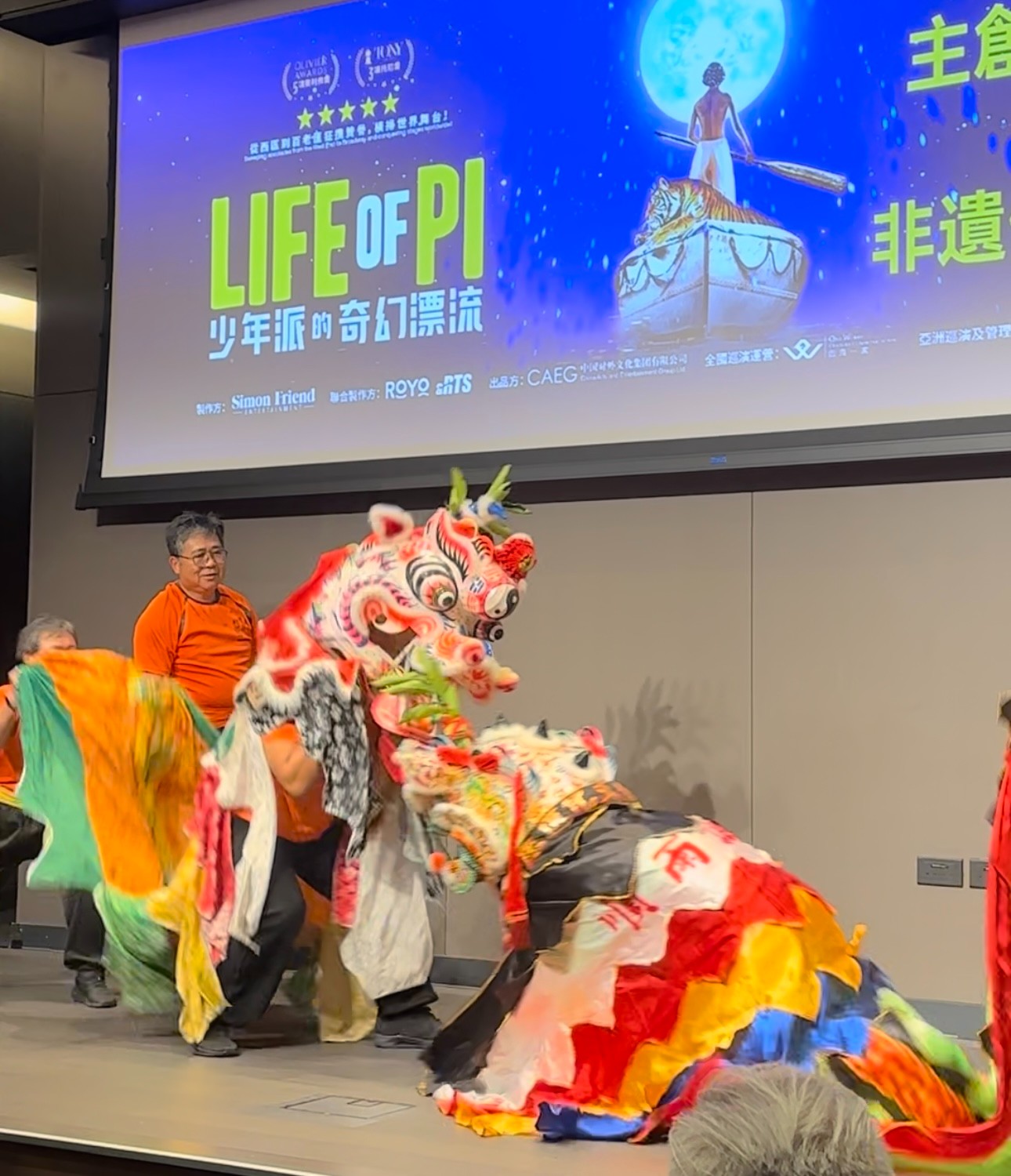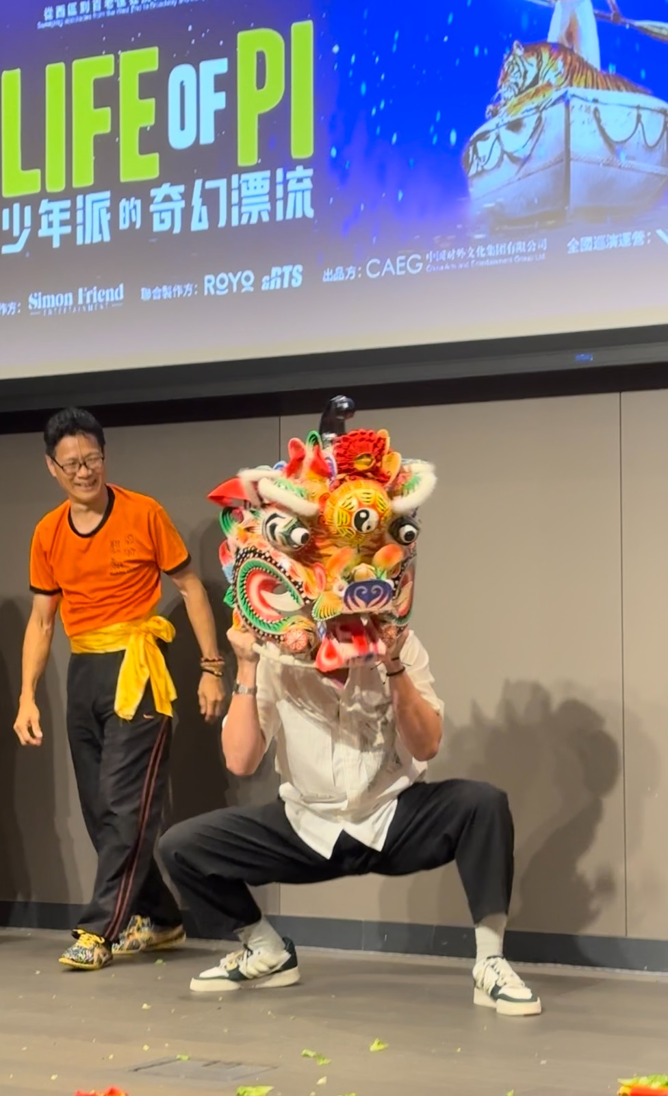 見面會當晚特別安排了「西貢坑口客家舞麒麟」表演。少年派主創團隊亦親身體驗如何舞麒麟。「虎偶戲趣.麒麟呈祥」之夜,讓西方木偶技藝與本地非遺藝術交匯,碰撞出新的火花。(記者 Alphy 圖片 Alphy、官方提供)