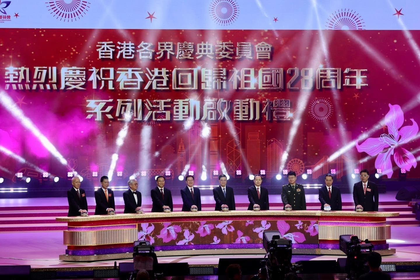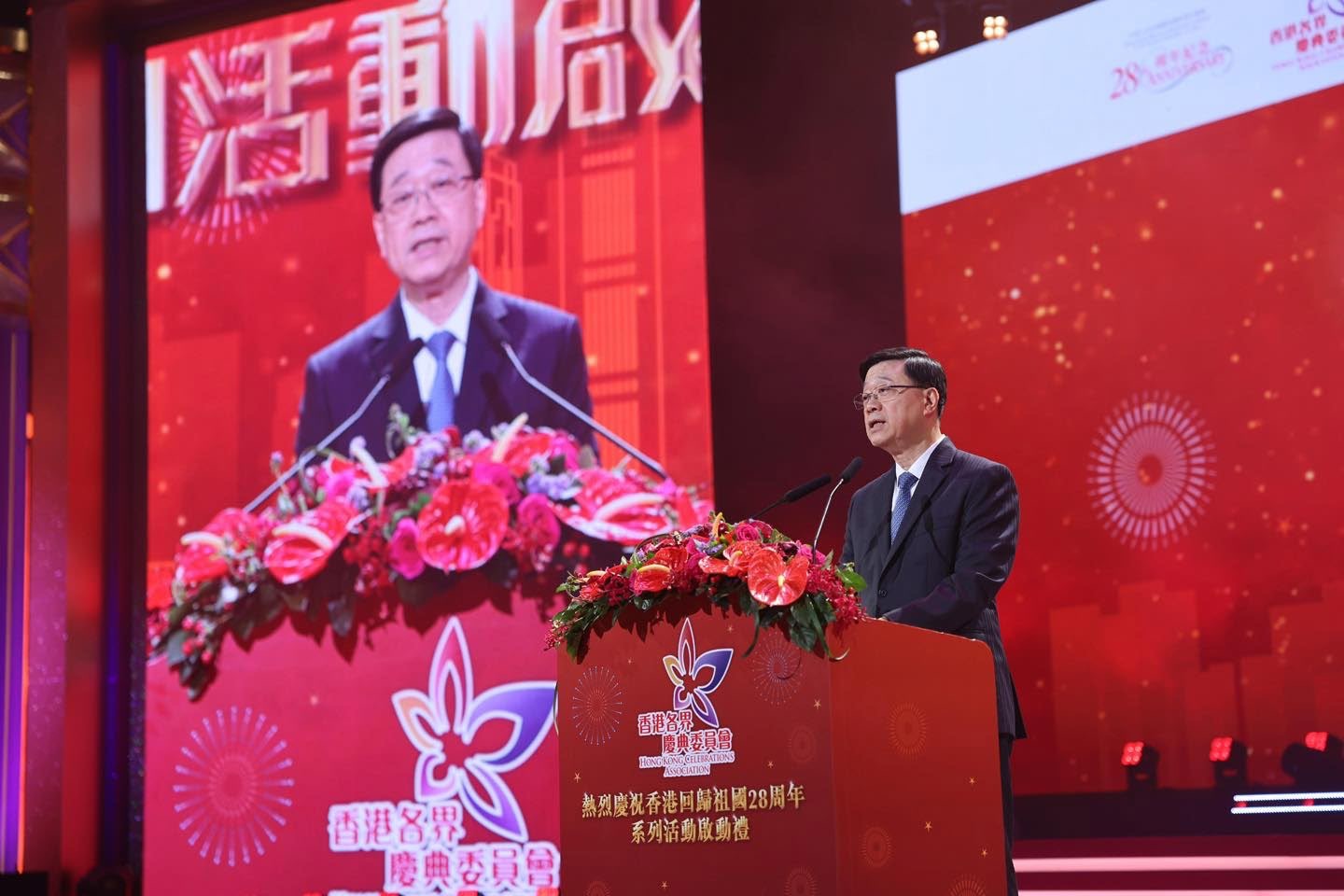 李家超又提到,特區政府今年慶祝回歸的主題是「攜手治及興,變革創未來」。特區政府將繼續全力發揮香港在「一國兩制」下內聯外通的優勢和作為「超級聯繫人」和「超級增值人」的角色。只要團結一致,社會各界與特區政府攜手努力,奮發前行,變革求新,共建更繁盛的香港,東方之珠將更加耀目璀璨。