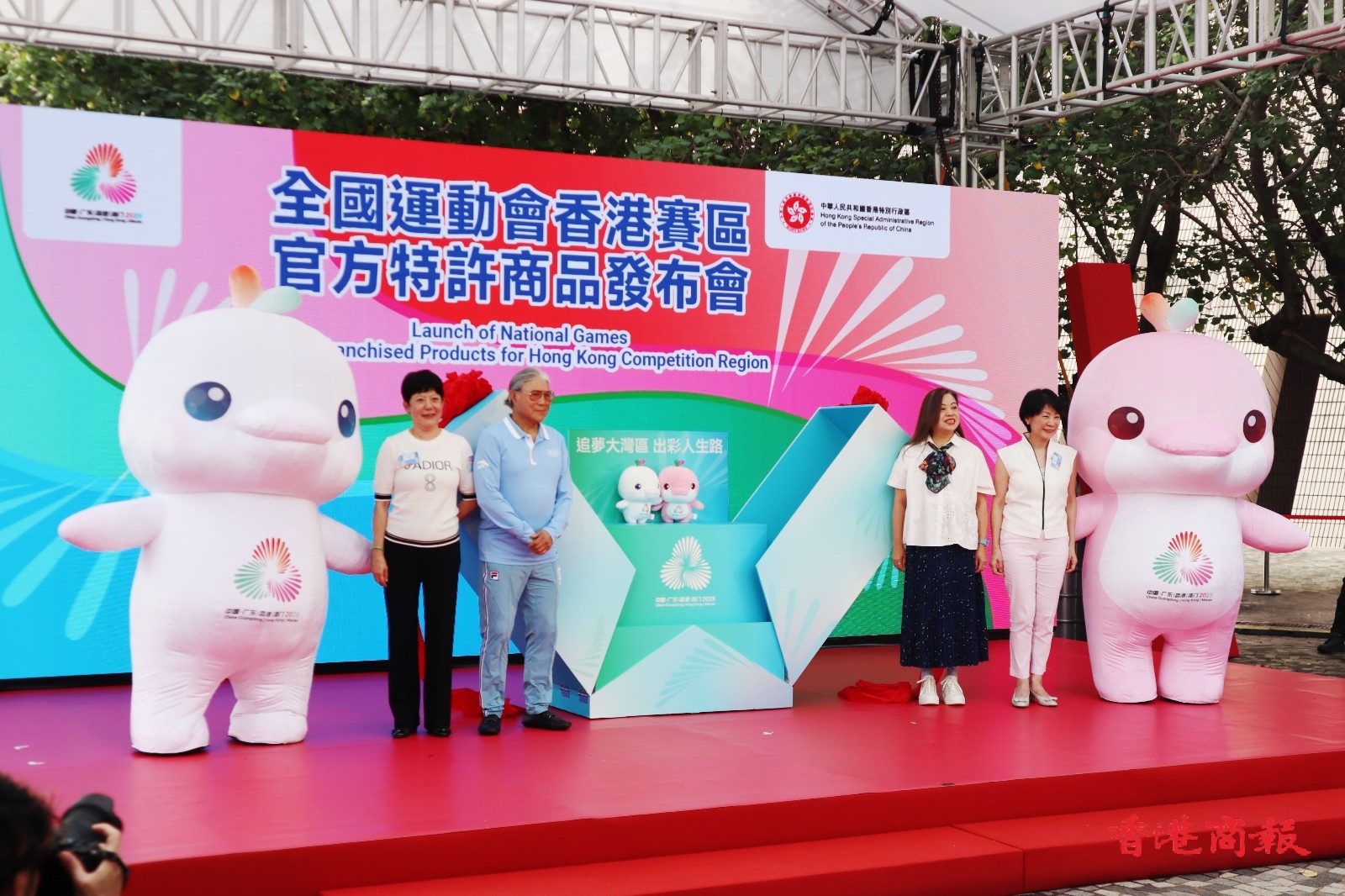 第十五屆全國運動會(十五運會)香港賽區官方特許商品發布會今日(12日)假尖沙咀文化中心舉行,並率先快閃發售十五運會紀念品。文化體育及旅遊局局長羅淑佩稱,本月14日起至十五運會期間將全面發售特許商品,首批官方零售店已進駐啟德體育園零售館、西九龍站及灣仔入境事務大樓,未來將陸續擴展至全港更多地點。特區代表團籌備委員會主席霍震霆率先購買了2400元紀念品給孫兒,最喜歡是白海豚吉祥物「喜洋洋」和「樂融融」。