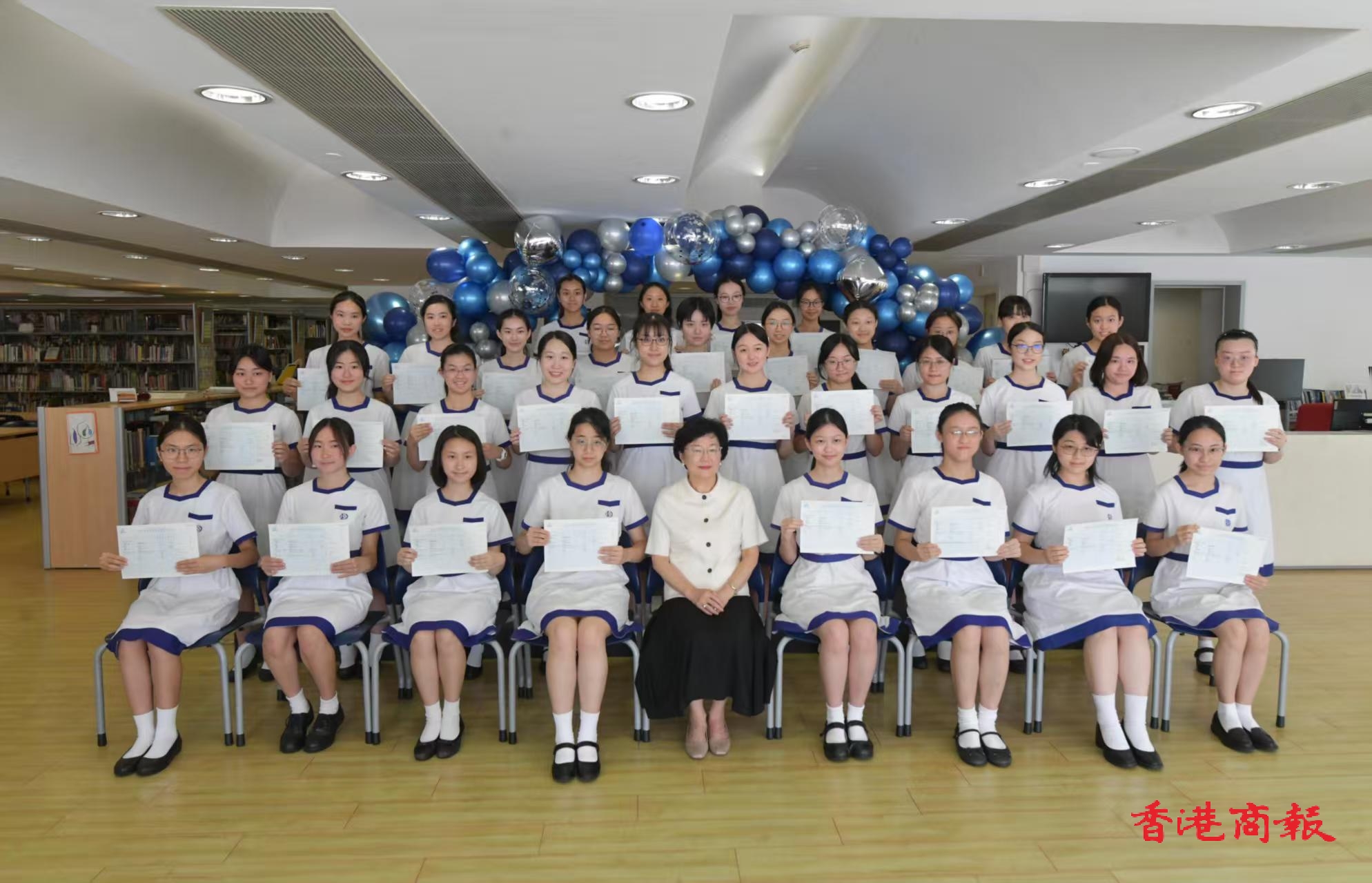 拔萃女書院校長劉靳麗娟(前排中) 跟該校文憑試考生合照。記者 崔俊良攝