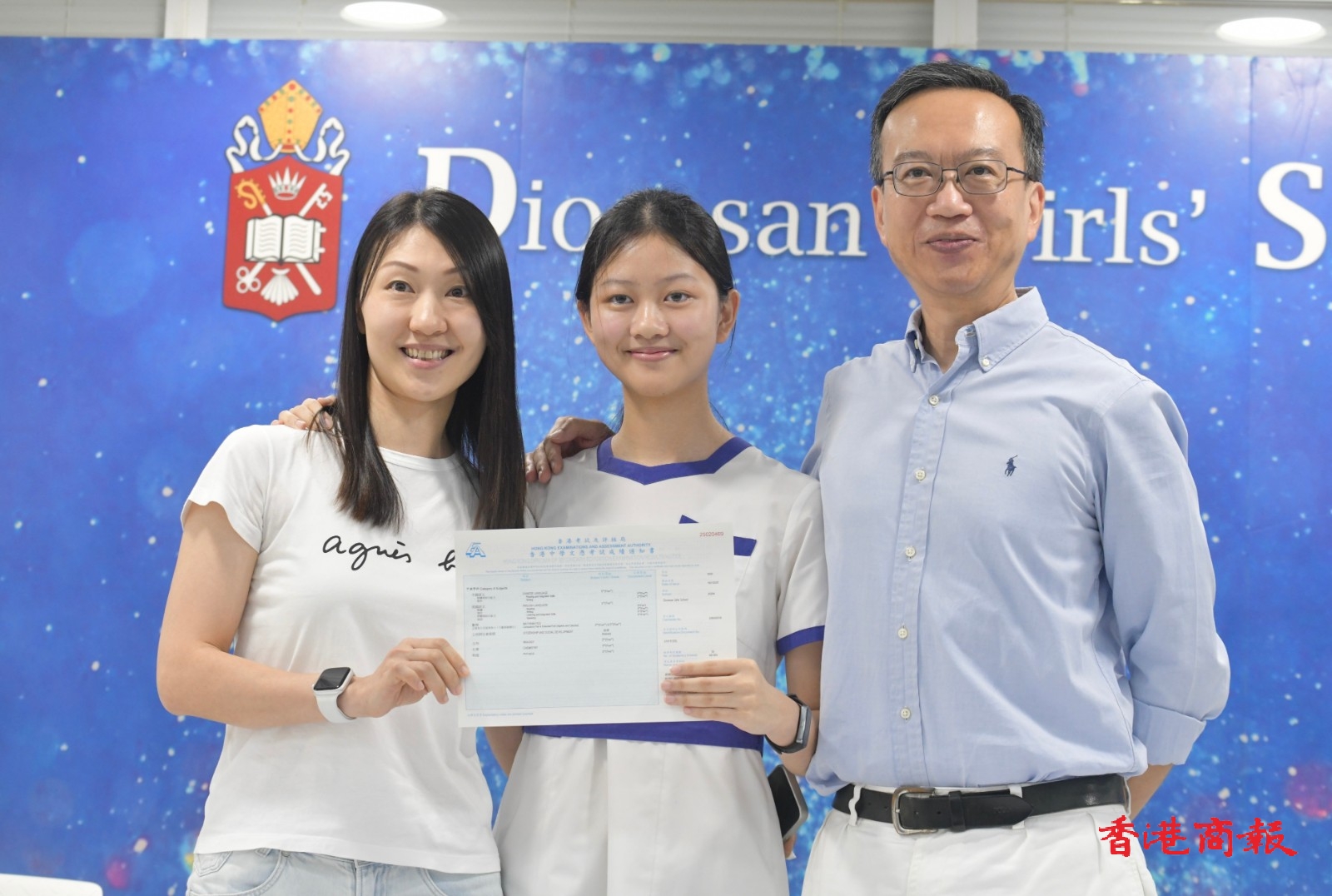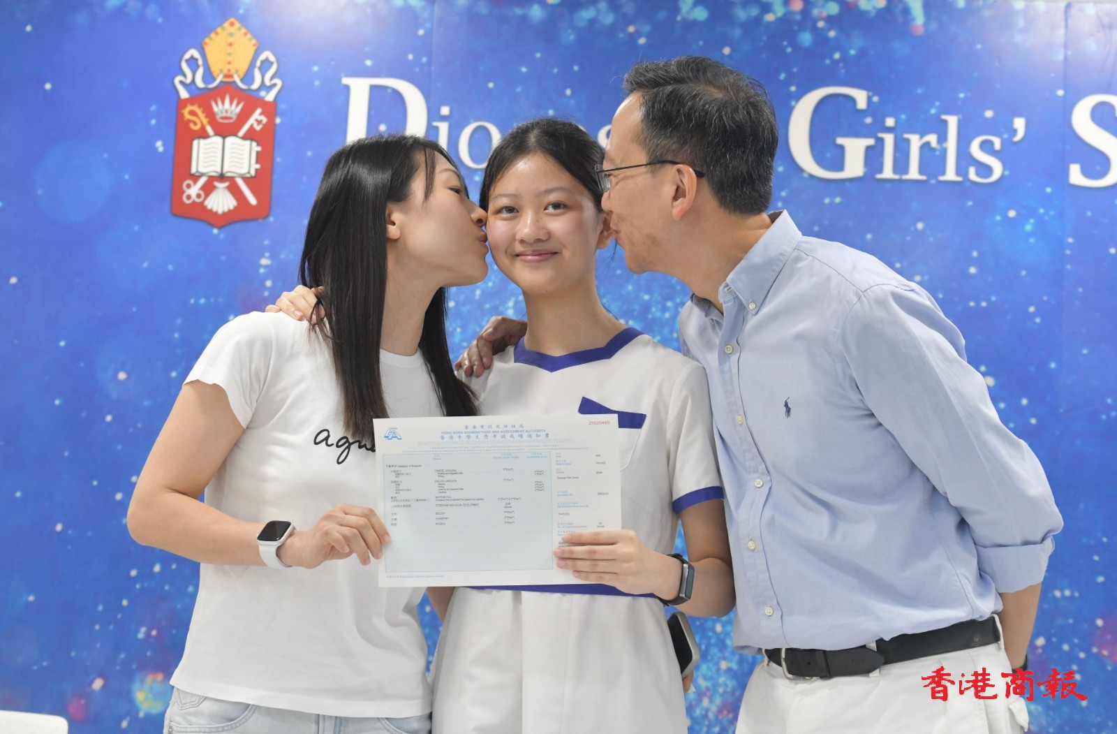 拔萃女書院「超級狀元」黃穎妍(中),獲父母親吻祝賀取得好成績。記者 崔俊良攝