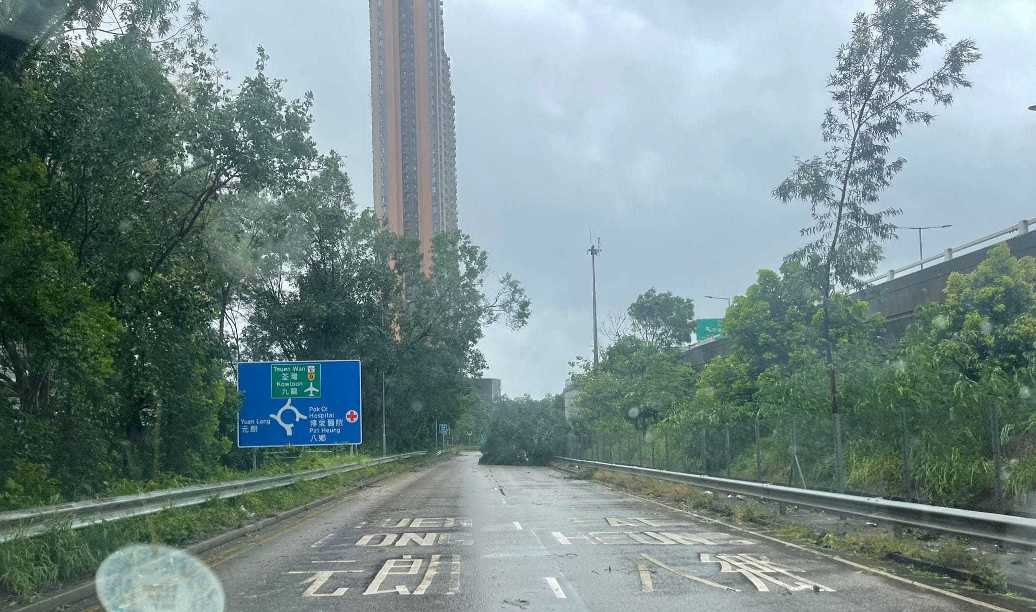 至中午12時許元朗公路支路往博愛交匯處方向有樹幹塌下行車道上,行經車輛需慢駛。中午12時20分,上水彩園路往大頭嶺村方向近彩蒲苑亦有大樹倒塌,樹冠壓落一條行車線,現場交通受阻。