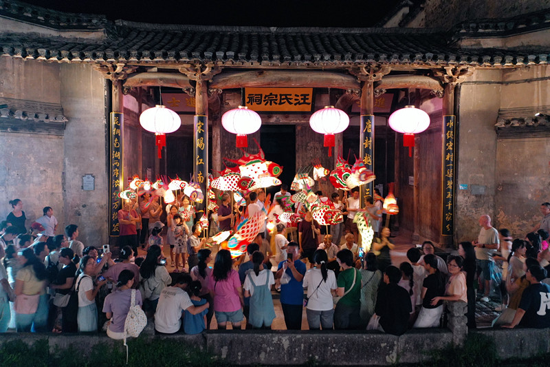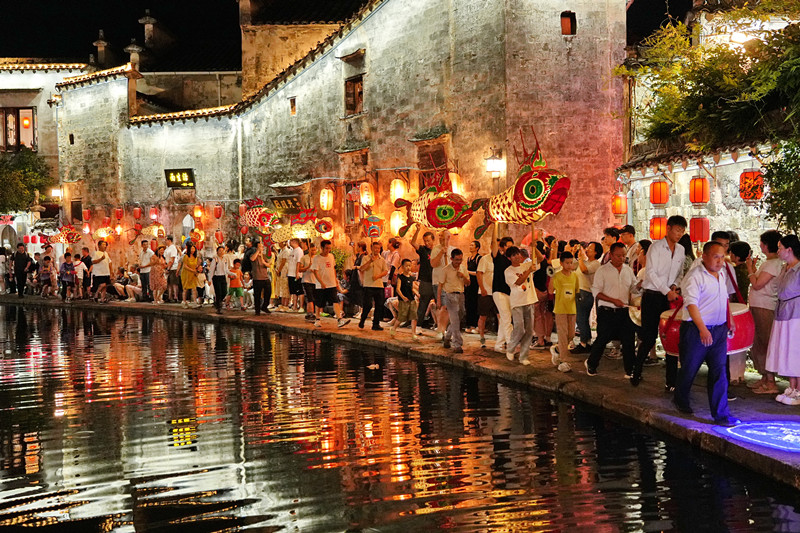 7月21日晚,安徽省黃山市黟縣宏村景區上演非遺項目舞魚燈,為遊客帶來一場精彩絕倫的視覺盛宴。