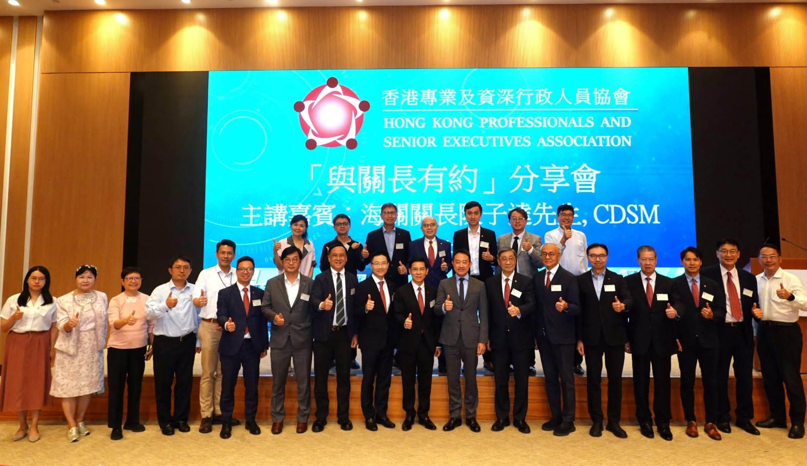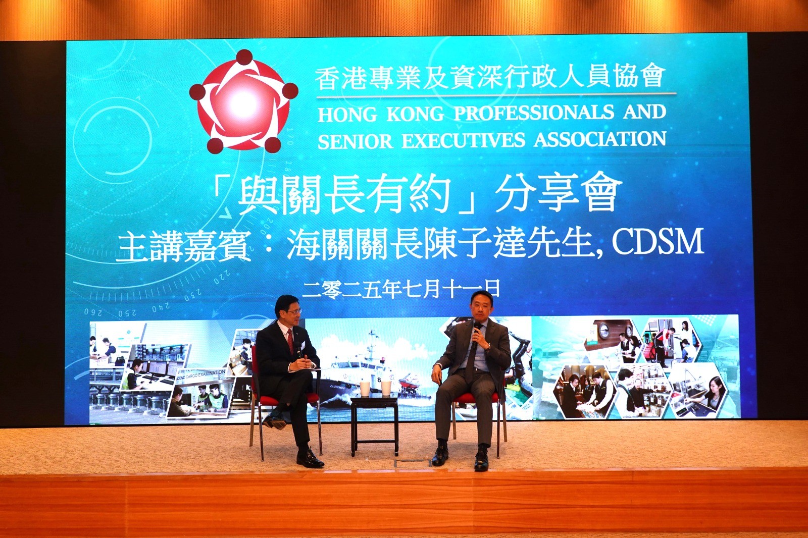 海關表示,海關關長陳子達早前出席香港專業及資深行政人員協會舉辦的「與關長有約」分享會,與會員分享海關多元化工作,以及在環球最新格局下,如何為國家和香港做好「把關者」角色,守護國家南大門,促進香港繁榮。
