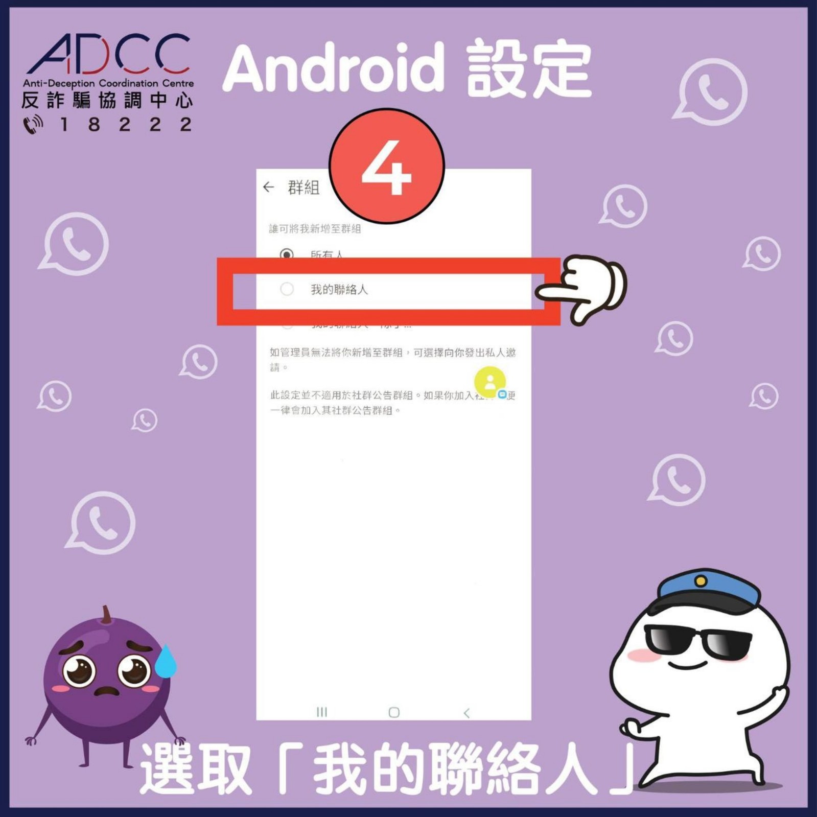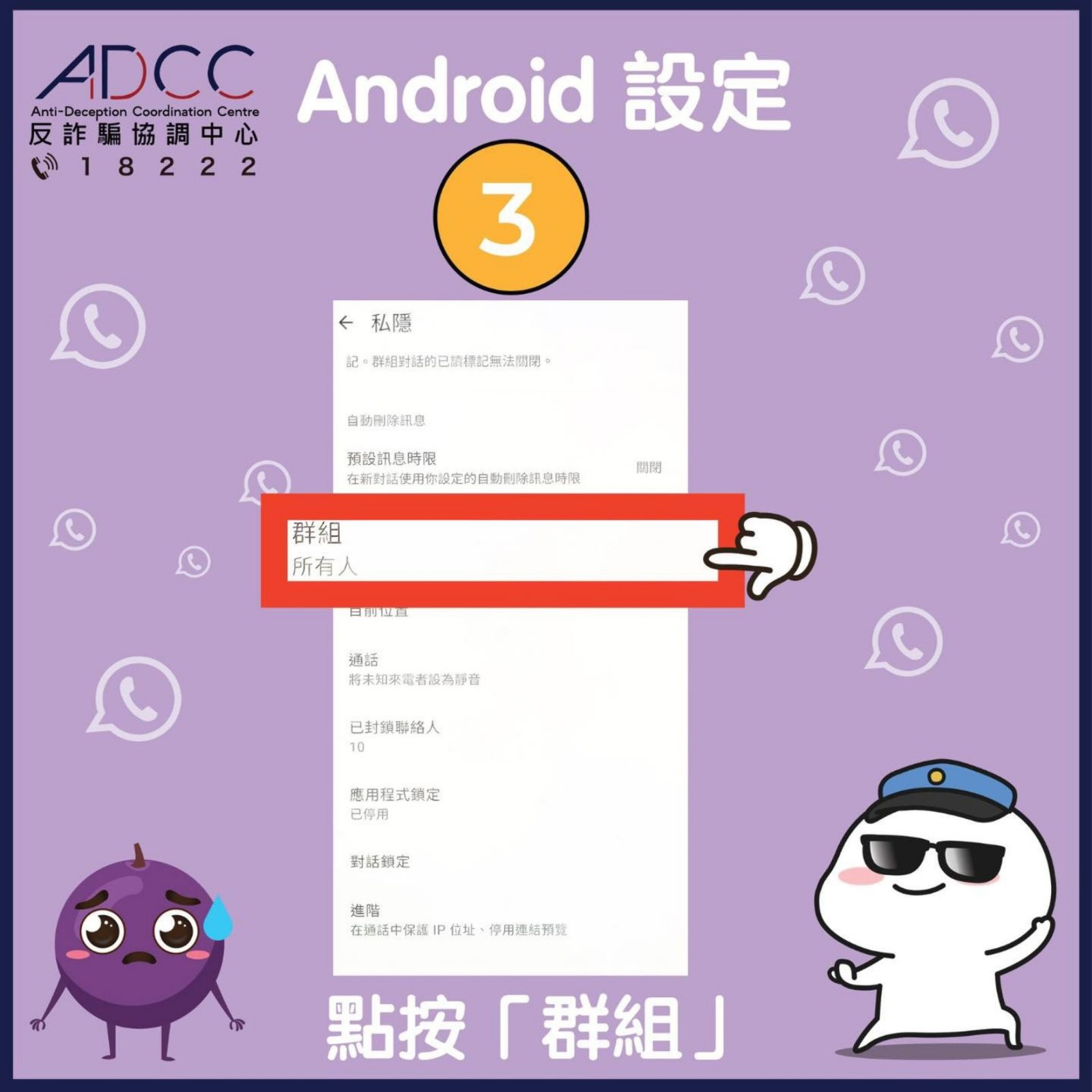 警方提醒,市民可在手機上WhatsApp程式點按「設定」、再點按「私隱 > 群組」,選取「我的聯絡人」,若彈出提示後按「完成」,以防止「白撞」訊息。(記者 區天海)