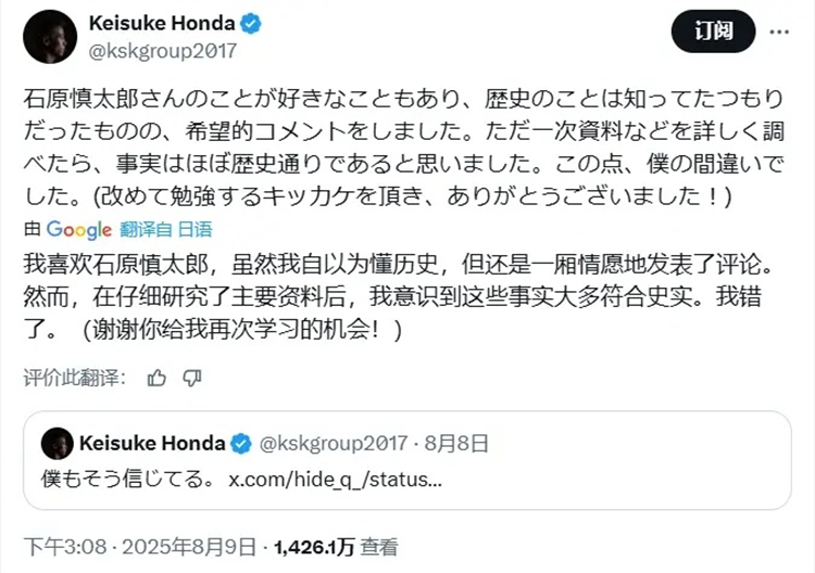 實際上,本田圭佑最初與許多日本人一樣,認為南京大屠殺的真實性「存疑」。8月8日,本田圭佑在社交平台「X」上轉發了一則日本知名右翼人物石原慎太郎生前的談話視頻,後者在視頻中聲稱「南京大屠殺缺乏證據」、「日軍難以在當時的時間和武器條件下實施大屠殺」。在轉發該視頻時,本田圭佑還稱「我也相信是這樣」。