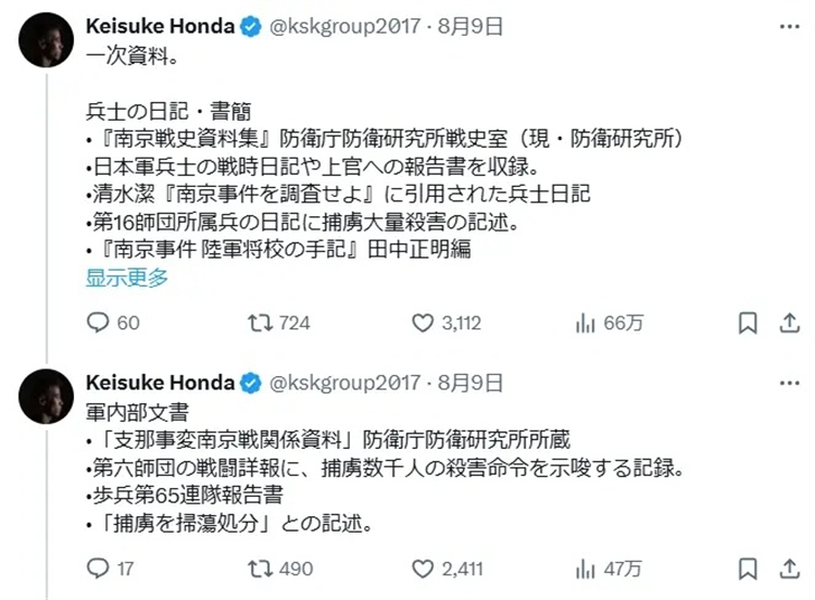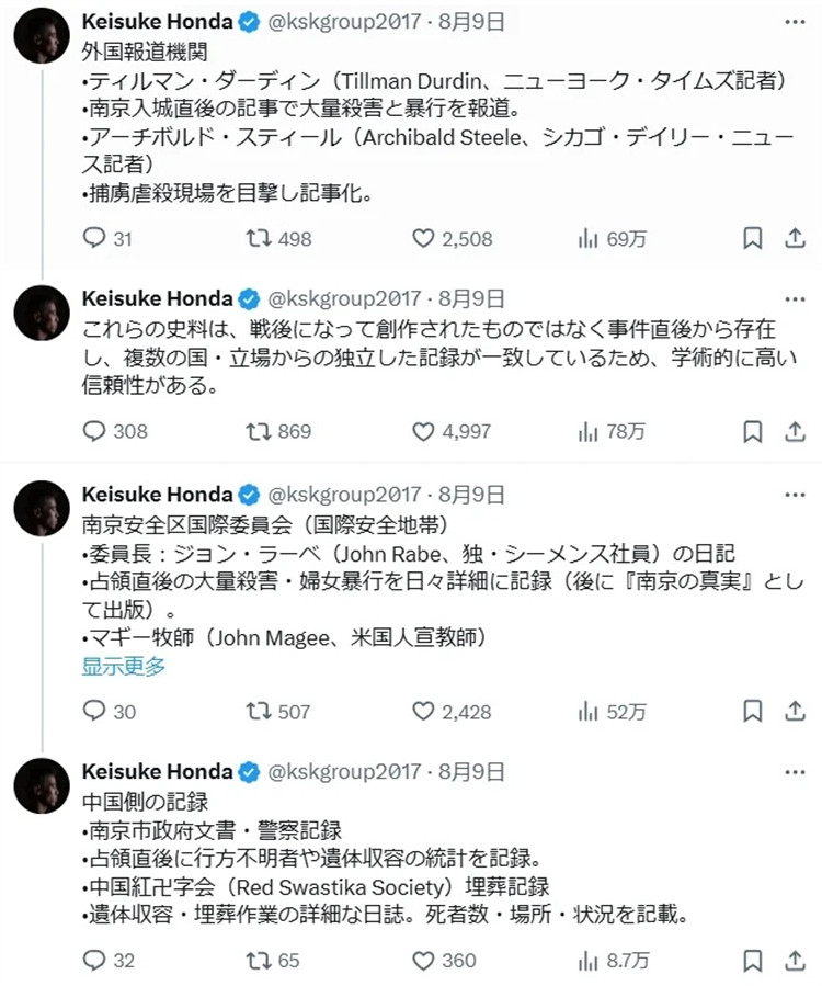 在轉發石原慎太郎視頻的第二天,8月9日,本田圭佑再次在「X」上貼出了大量與南京大屠殺相關的歷史材料,其中包括中國官方的記錄、當時「南京安全區國際委員會」的記錄、外國媒體的報道,乃至日軍自己的相關記錄等。本田圭佑表示,這些歷史文獻不是戰後創作的,並且是來自多個國家、觀點一致的獨立材料,因此在學術上具備很高的可靠性。