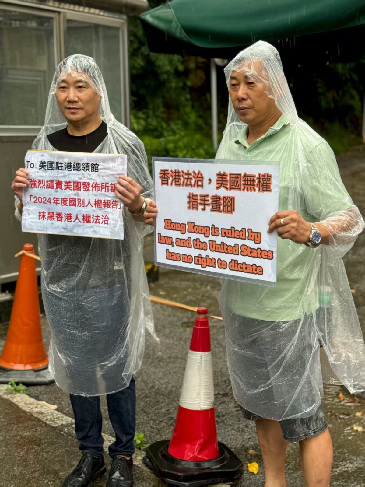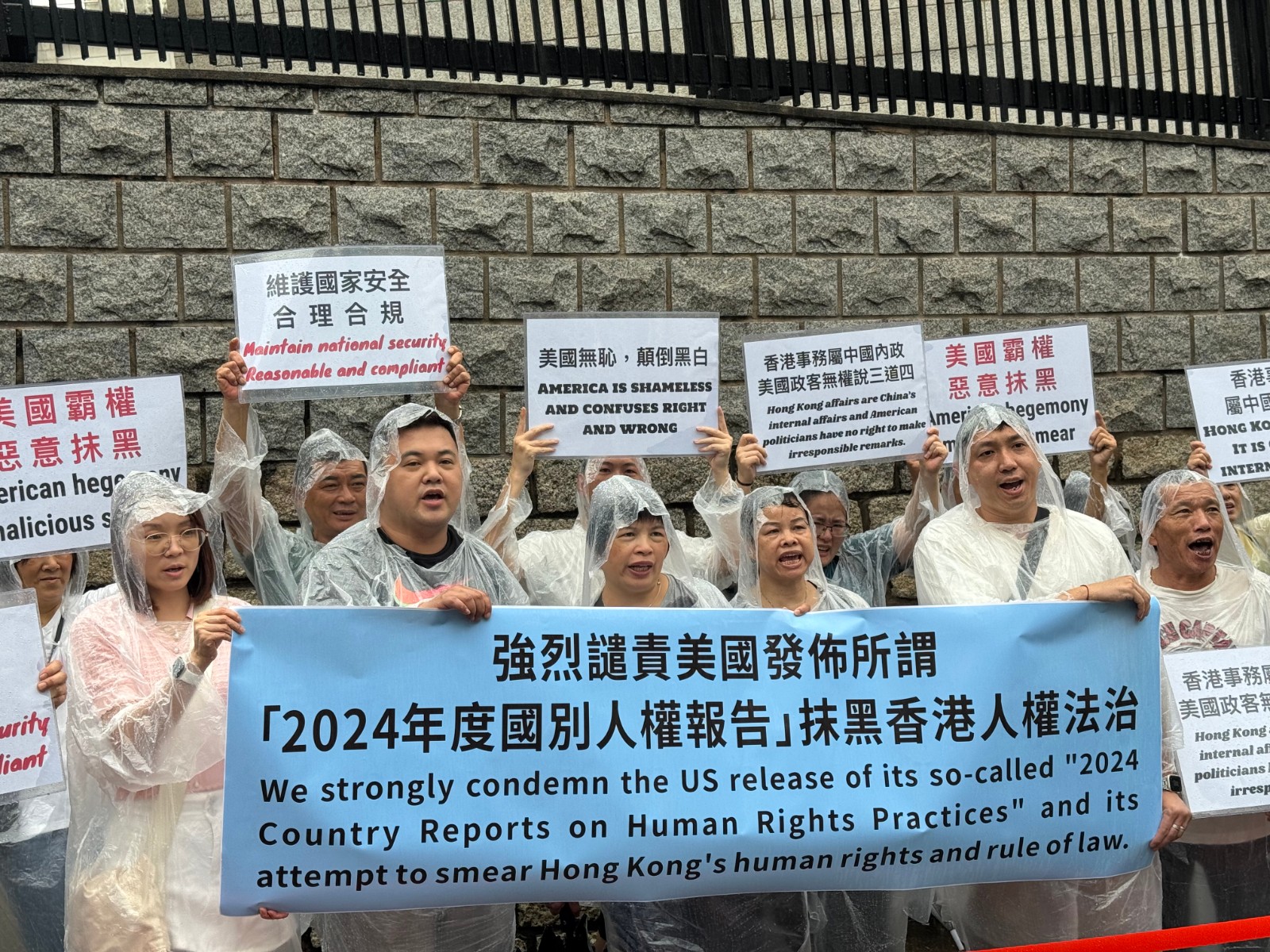 多個政團及市民今日(14日)冒着暴雨到美國駐港領事館請願,抗議及譴責美國再度說三道四。他們強烈不滿及堅決反對美國國務院發布的所謂「2024年度國別人權報告」,詆毀香港維護國家安全的法律和抹黑香港人權法治狀況。