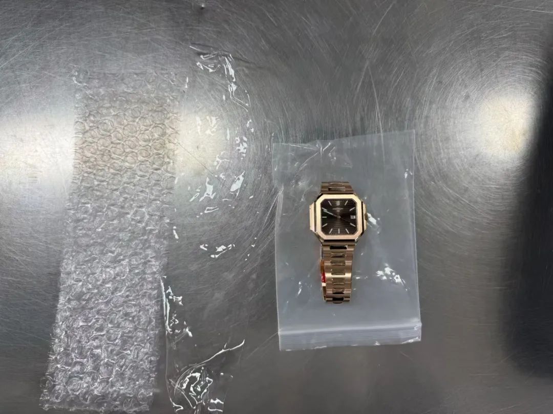 羅湖海關在對進境旅客進行監管時,發現一名男性旅客進入海關監管區未向海關申報,且步履匆忙,企圖快速離開海關監管區,海關關員隨即對其進行攔截檢查。經檢查,海關關員在該旅客褲子口袋內發現塑膠膜1張及透明密封袋1個。經進一步檢查,海關關員發現該旅客左手戴未拆保護膜的疑似全新百達翡麗(Patek Philippe)手表1隻。