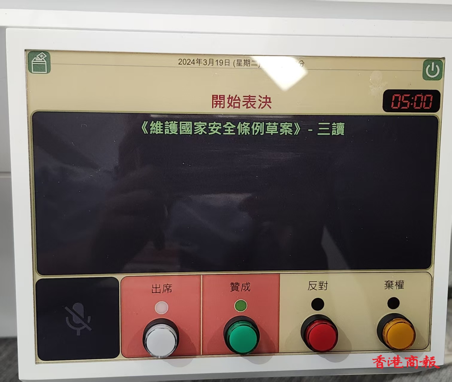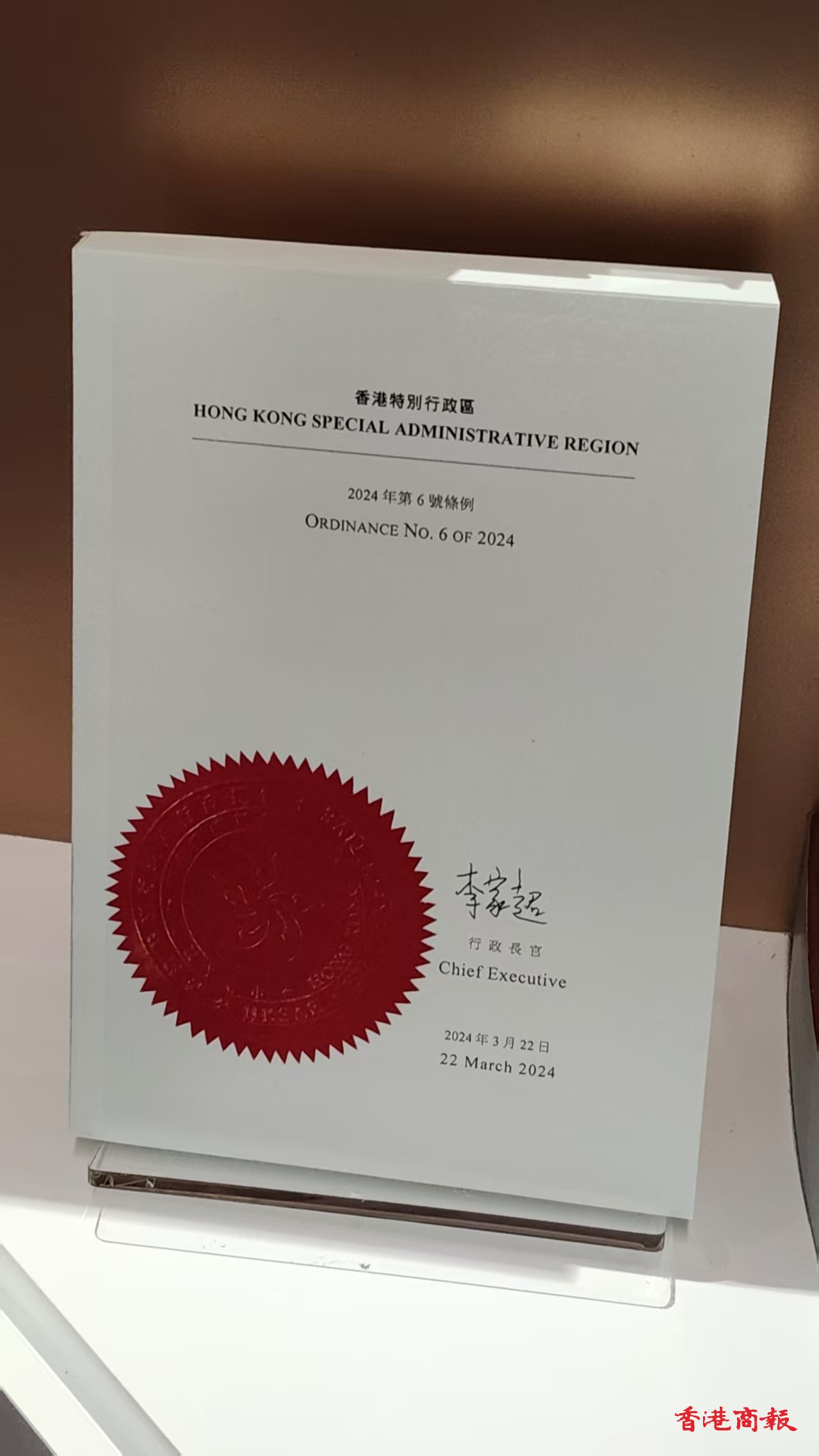 微縮模型左邊有特首李家超去年3月22日簽署的「2024年第6號條例」的文件。