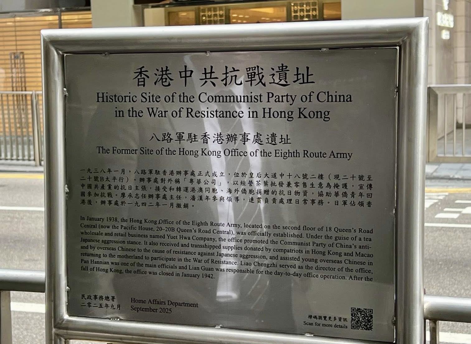 張國鈞今午(2日)在社交平台發文說:「80年前的歷史事件看似很遙遠的事情,但不少歷史痕跡其實就在我們身邊。」他指,其實在全港多區有不少與抗戰有關的歷史遺址,記載了香港在抗日戰爭期間民眾保家衛國的英勇事蹟。「近在咫尺,在律政中心附近,位於中環皇后大道中的『太平行』,平日熙來攘往,其實前身為八路軍駐香港辦事處的遺址。」他說。