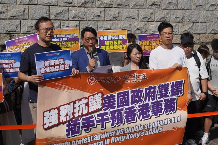 美國近期發布所謂「香港政策法報告」,對香港事務的粗暴干預,引起各界不滿。工聯會及一批市民今日(5日)到美國駐港澳領事館請願,就美國近期一系列粗暴干預香港事務的行為表示強烈抗議和堅決反對。