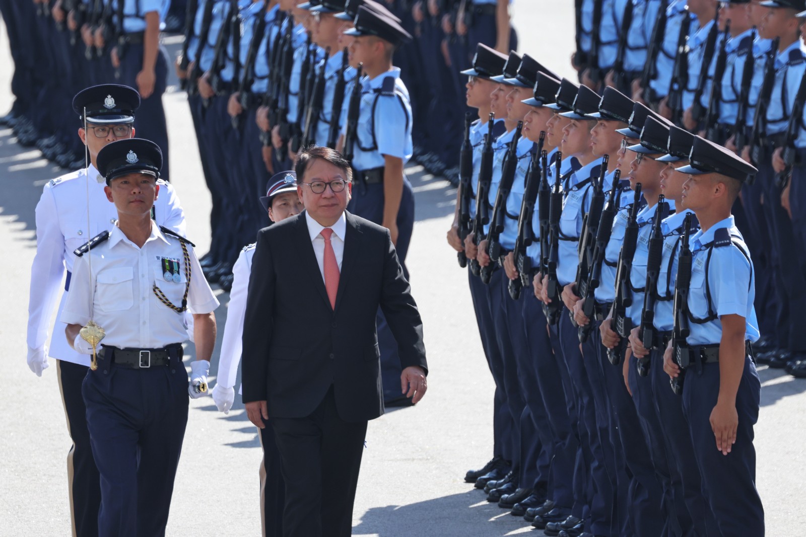 政務司司長陳國基今日(6日日)出席香港警察學院結業會操,檢閱30名見習督察及182名學警,見證他們正式成為警隊的一分子。陳國基發表致辭時對結業的督察和警員提出四點期盼,包括:永葆忠誠,恪守法律;精確專業、擁抱變革;心繫社群、仁勇兼備;及胸懷家國、放眼世界。