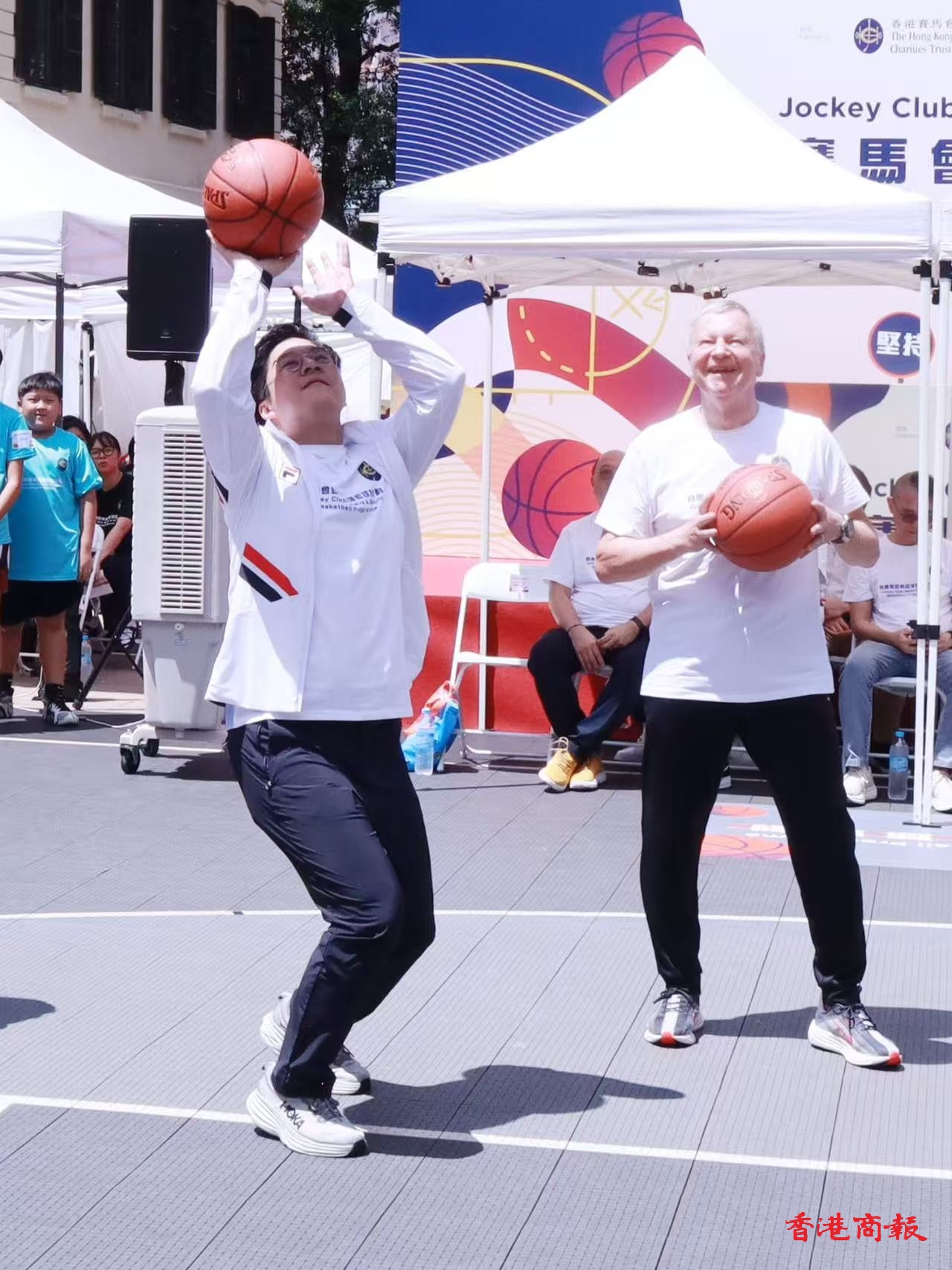 文體旅局局長羅淑佩、立法會議員霍啟剛、賽馬會行政總裁應家柏與青少年運動員一起玩籃球。