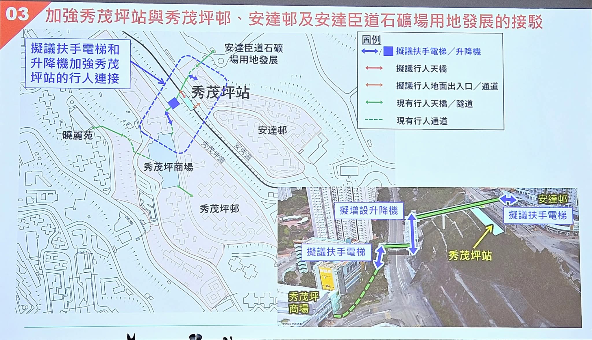 二是秀茂坪站會增加兩組扶手電梯,方便安達邨及秀茂坪邨居民來往車站。
