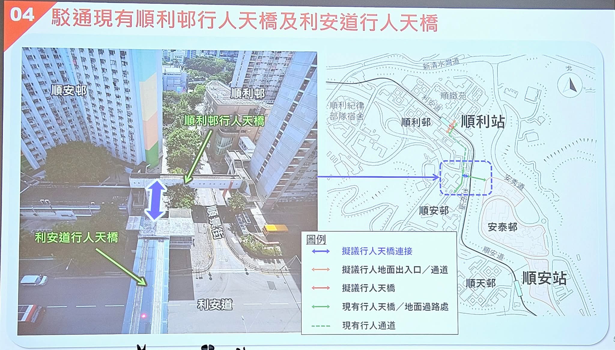 此外,顏汶羽感謝路政署回應地區聲音,優化幾個車站的優化行人接駁網絡,一是接納民建聯對優化順利站行人接駁設施的建議,將現時安泰邨往返順安邨的行人天橋與順利邨與順安邨的行人天橋接駁起來,讓順安邨及安泰邨居民可以有全段有上蓋的行人通道,目標在2029-2030年動工。