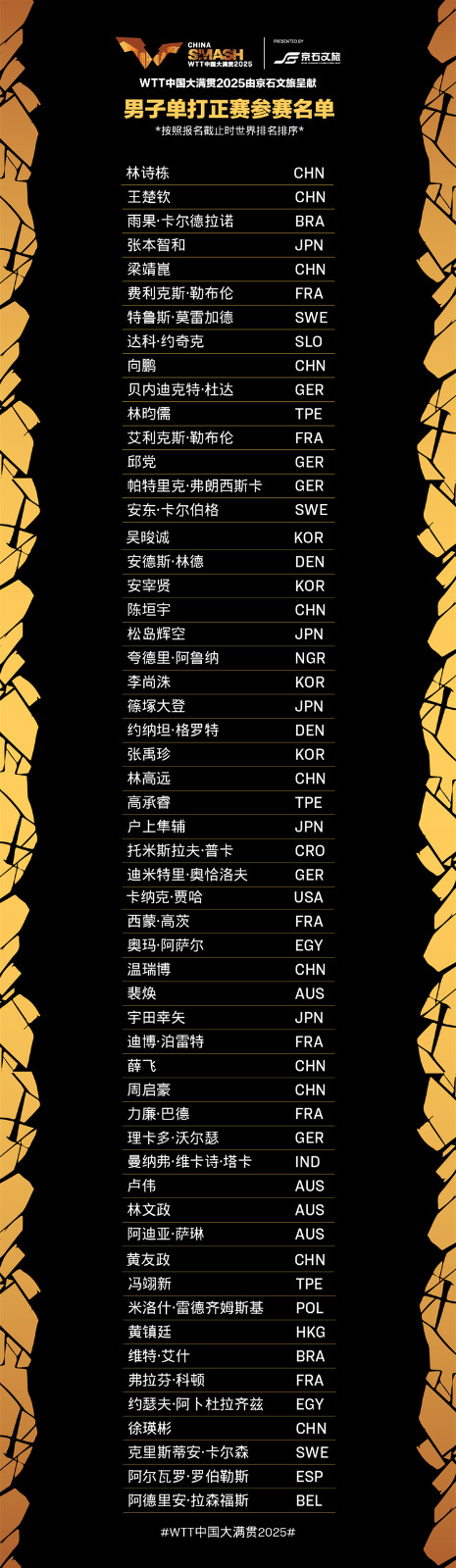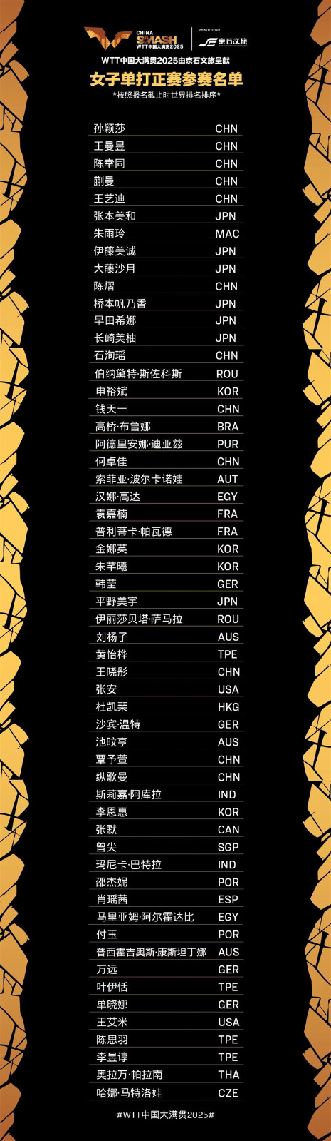 9月28日開打!WTT中國大滿貫2025正賽名單公布↓