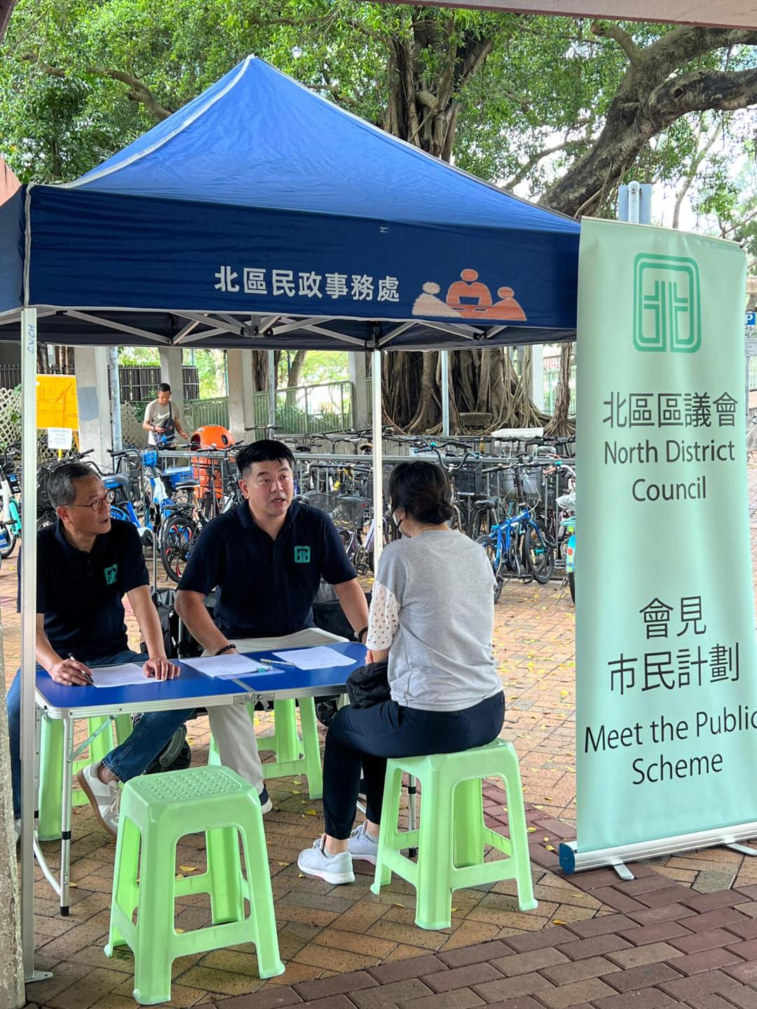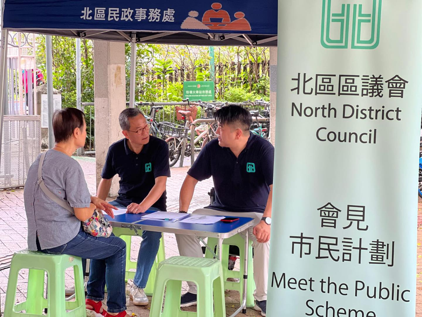 民政事務總署在社交平台發文表示,北區流動會客室自4月初次登場,街坊很支持,向區議員提供不少有關區內社區設施、交通問題等的建議。北區區議員李冠洪和吳耀祖今日(28日)將「流動會客室」帶到粉嶺地鐵站C出口外,聆聽市民聲音。