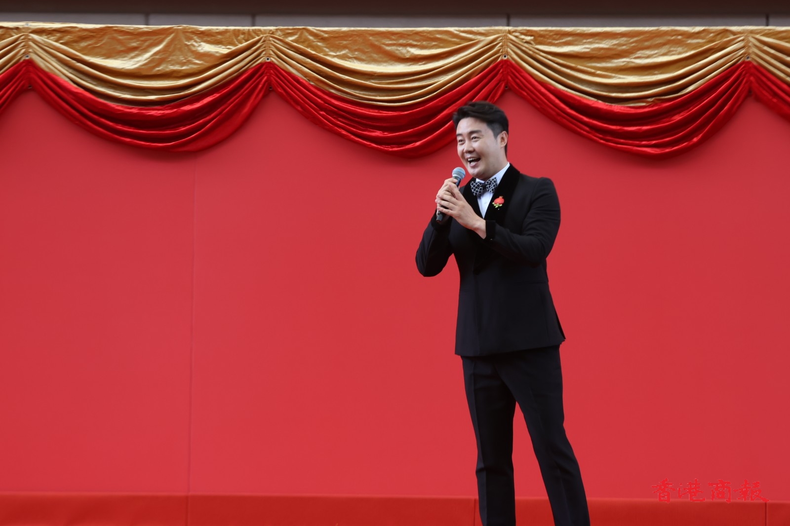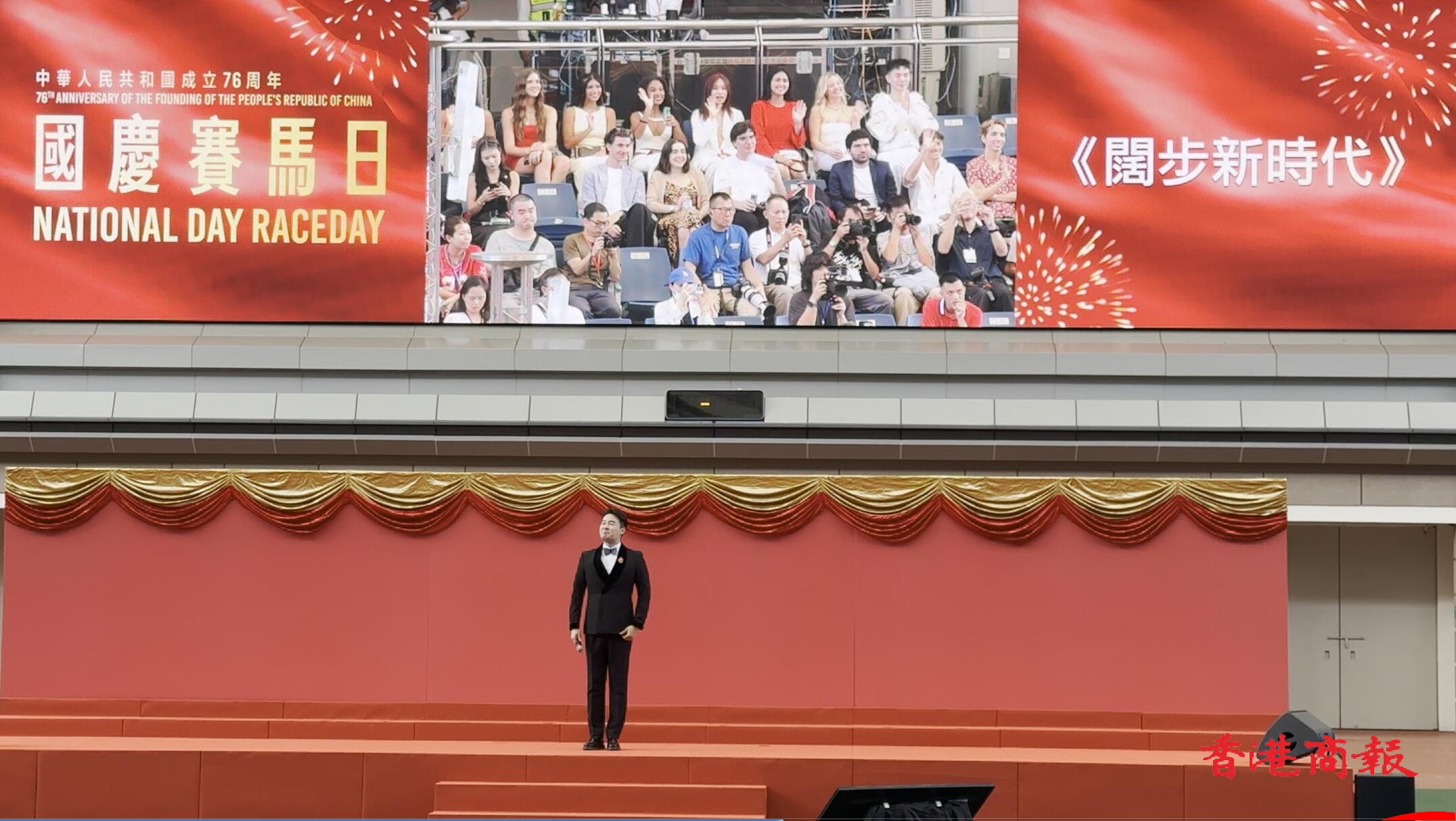 今日(1日)沙田馬場舉行國慶賽馬日,全日編有10場賽事。繼上年國慶日之後,馬會再次邀請中國著名男高音歌唱家張英席在開幕儀式上獻唱。張英席先後獻唱《闊步新時代》、《我的祖國》、《歌唱祖國》,並領唱國歌,為全日賽事掀開序幕 。(文/圖/片:志誠)