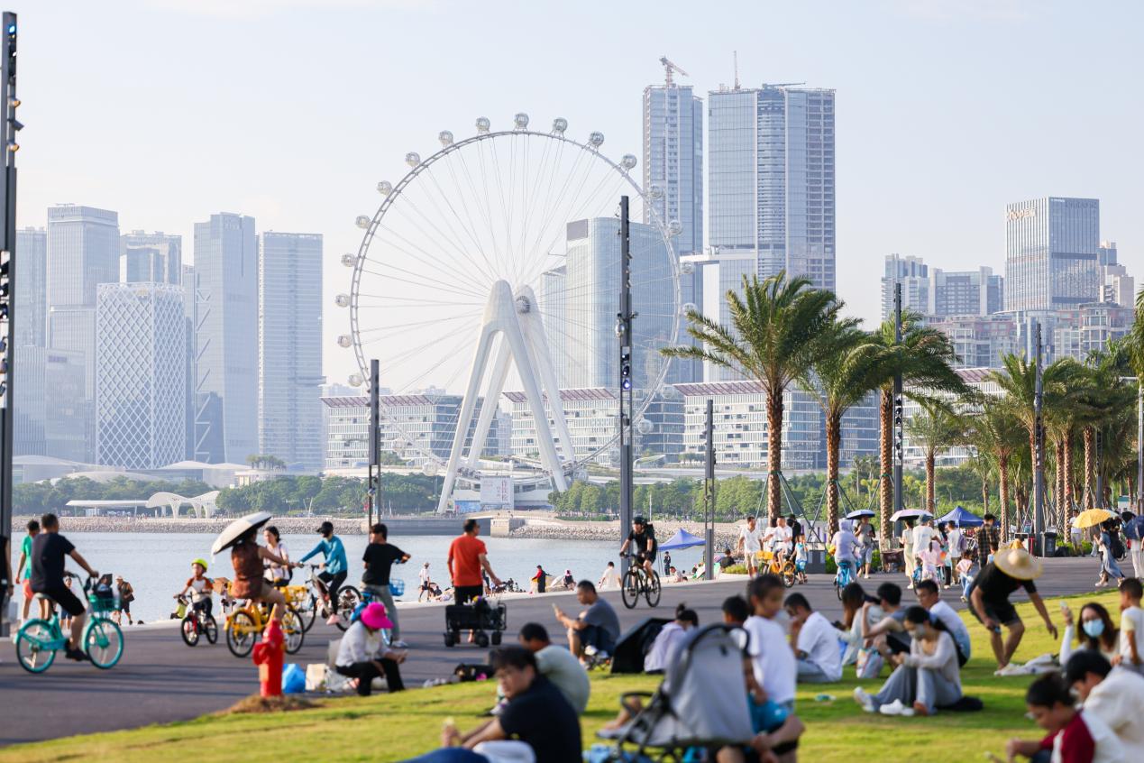 海邊的都市沙池設有休閒躺椅與遮陽傘,坐擁270度環海視野。遠眺「灣區之光」摩天輪與壯麗天際線,海風拂面,盡顯「前海福尼亞」的悠然意蘊。假日期間,該處將上演音樂演出、露天放映、藝術沙龍、日咖夜酒等多樣文化活動,營造兼具格調與溫度的城市休閒空間。