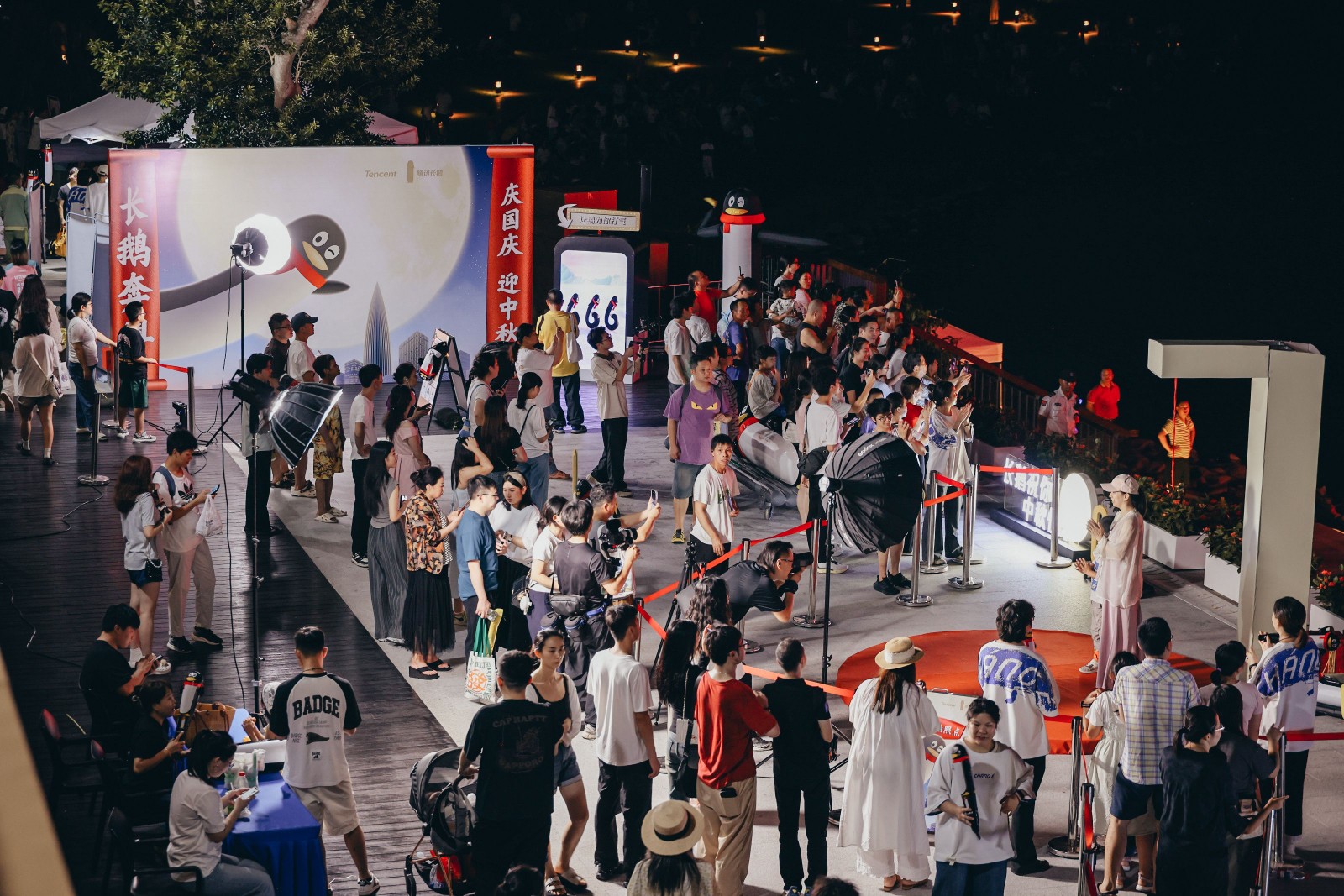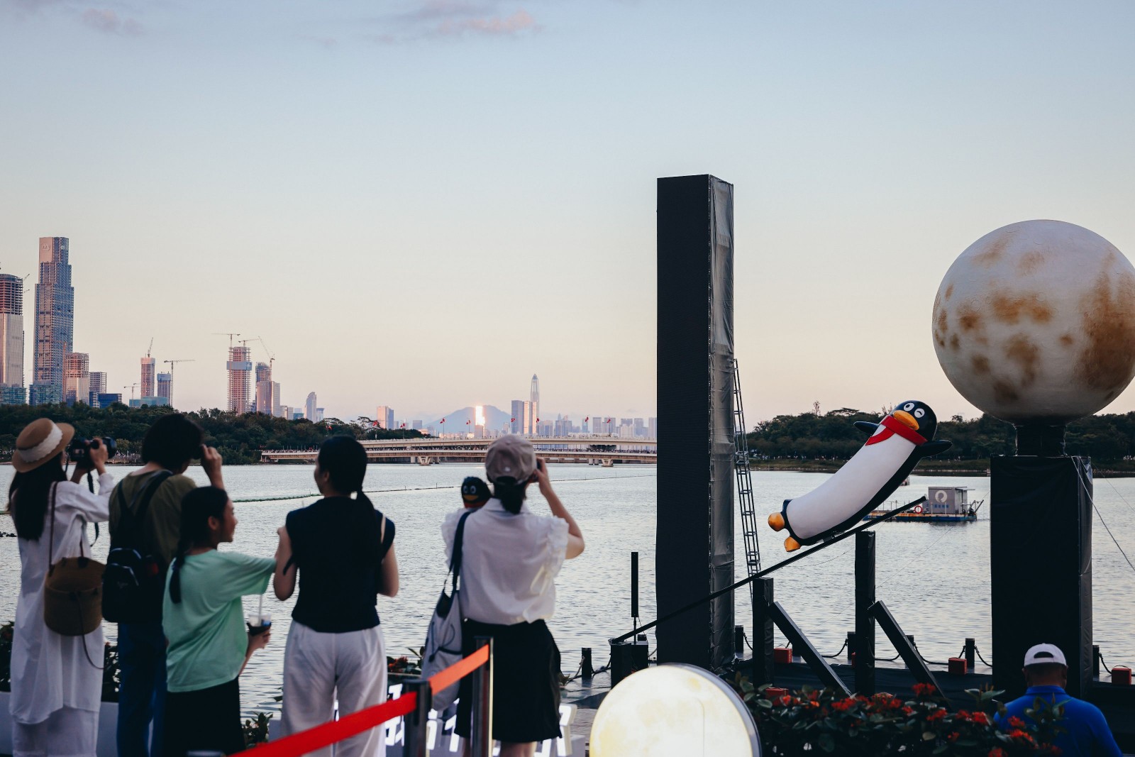 10 月 2 日晚19點,在廣東深圳人才公園求賢閣·親水平台,一場名為「長鵝奔『粵』」的主題活動正式展開,吸引了大量市民到場圍觀參與。活動現場的核心裝置以「長鵝奔『粵』」為主題,融合中秋傳統文化與深圳城市特色,參與者只需拉動繩索,即可觸發裝置呈現「圓月浮現,長鵝騰空起」的畫面。