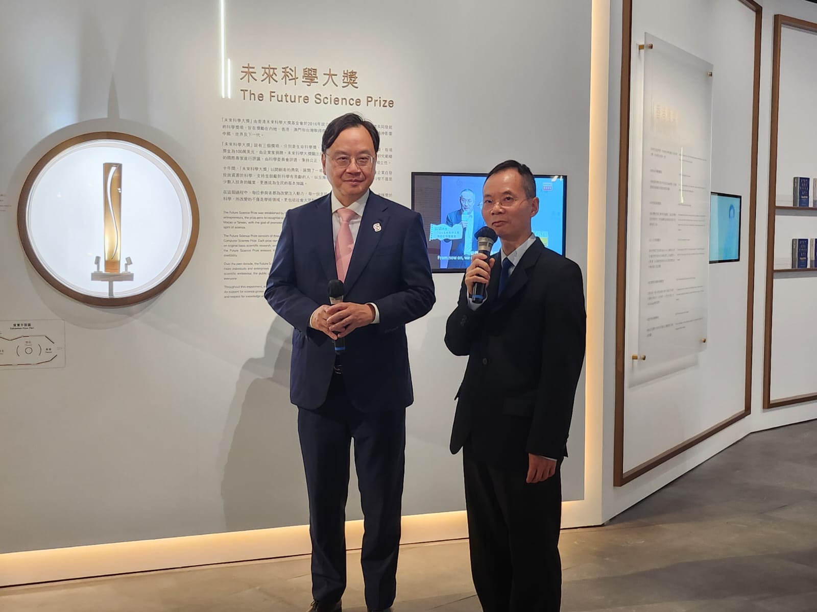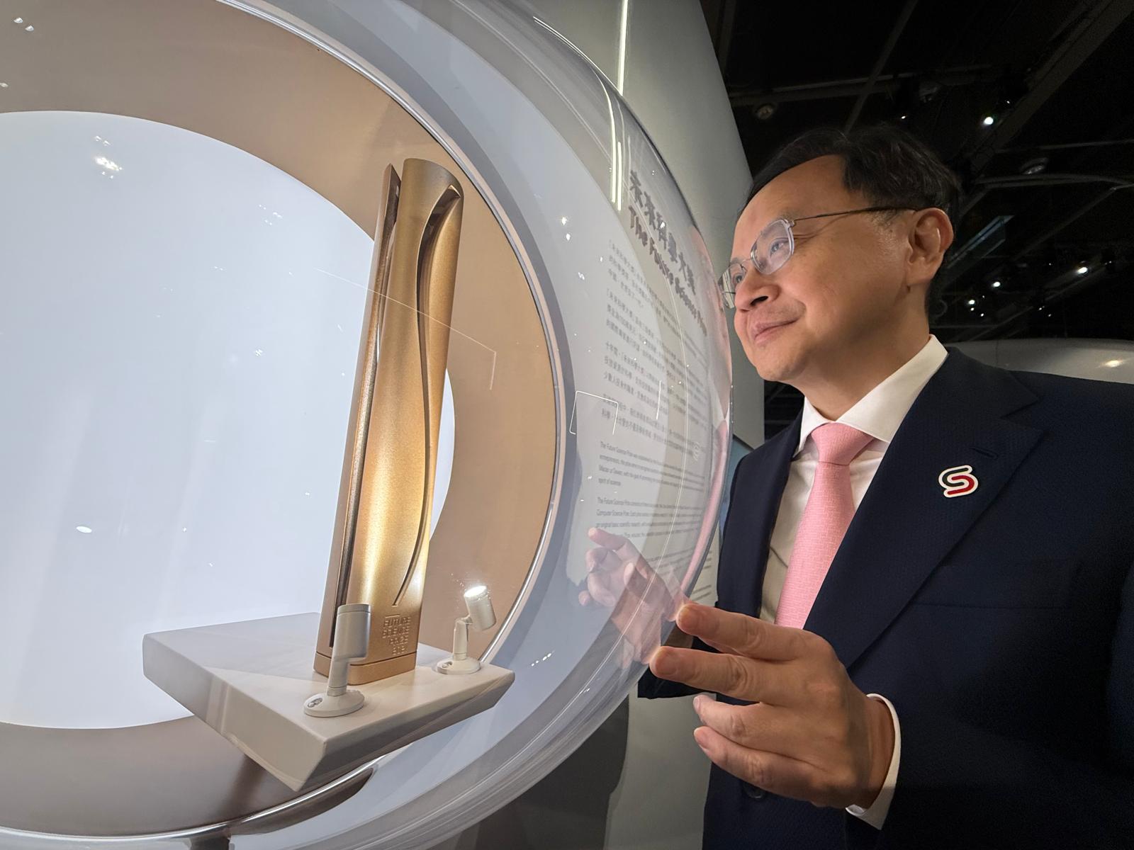 今次展覽也首度展出未來科學大獎獎座。作為首屆生命科學獎得主的盧煜明教授笑言,自己其實有兩個大獎獎座,因為未來科學大獎更新獎座設計後,他再獲贈新版的獎座。