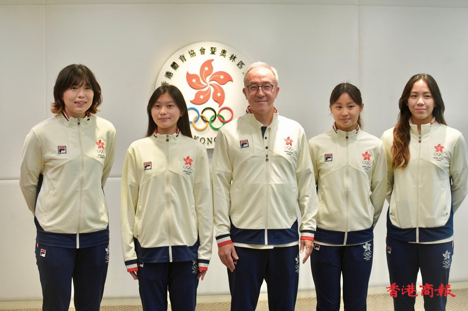 巴林2025亞洲青年運動會中國香港代表團團長莫君逸(中)與4位參賽運動員合照(左一:亞青運排球青年隊隊長唐曉晴、左二跆拳道運動員黃靖楠、右二三項鐵人運動員吳悅曦、右一游泳代表文薈喬)。記者 崔俊良攝