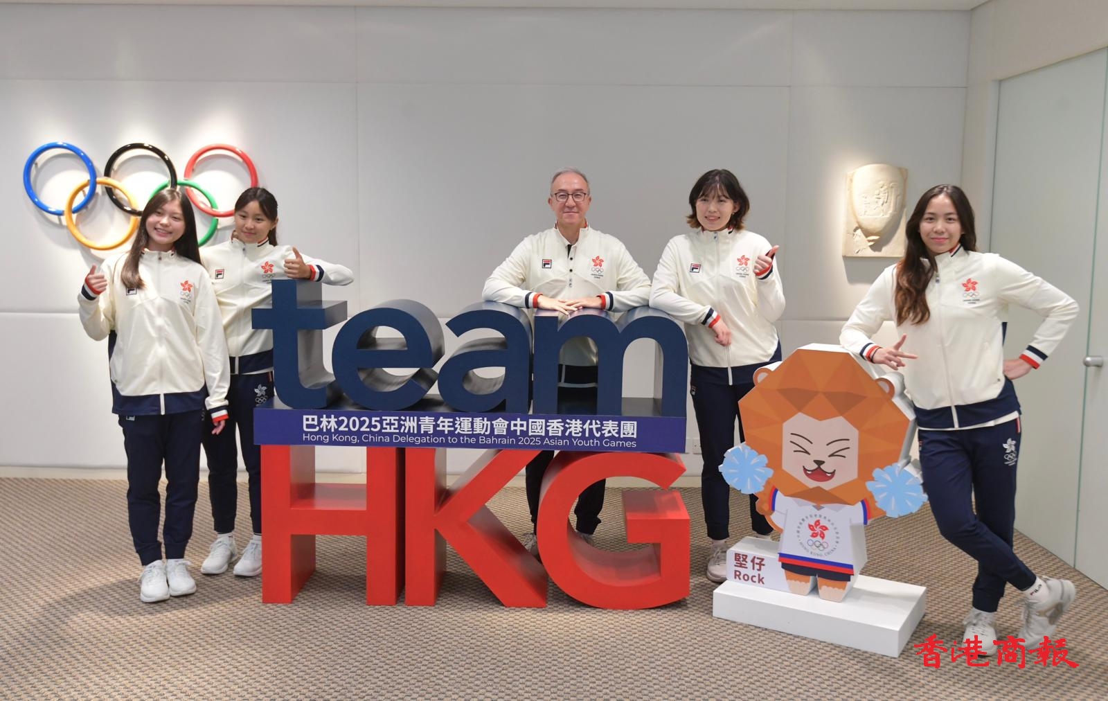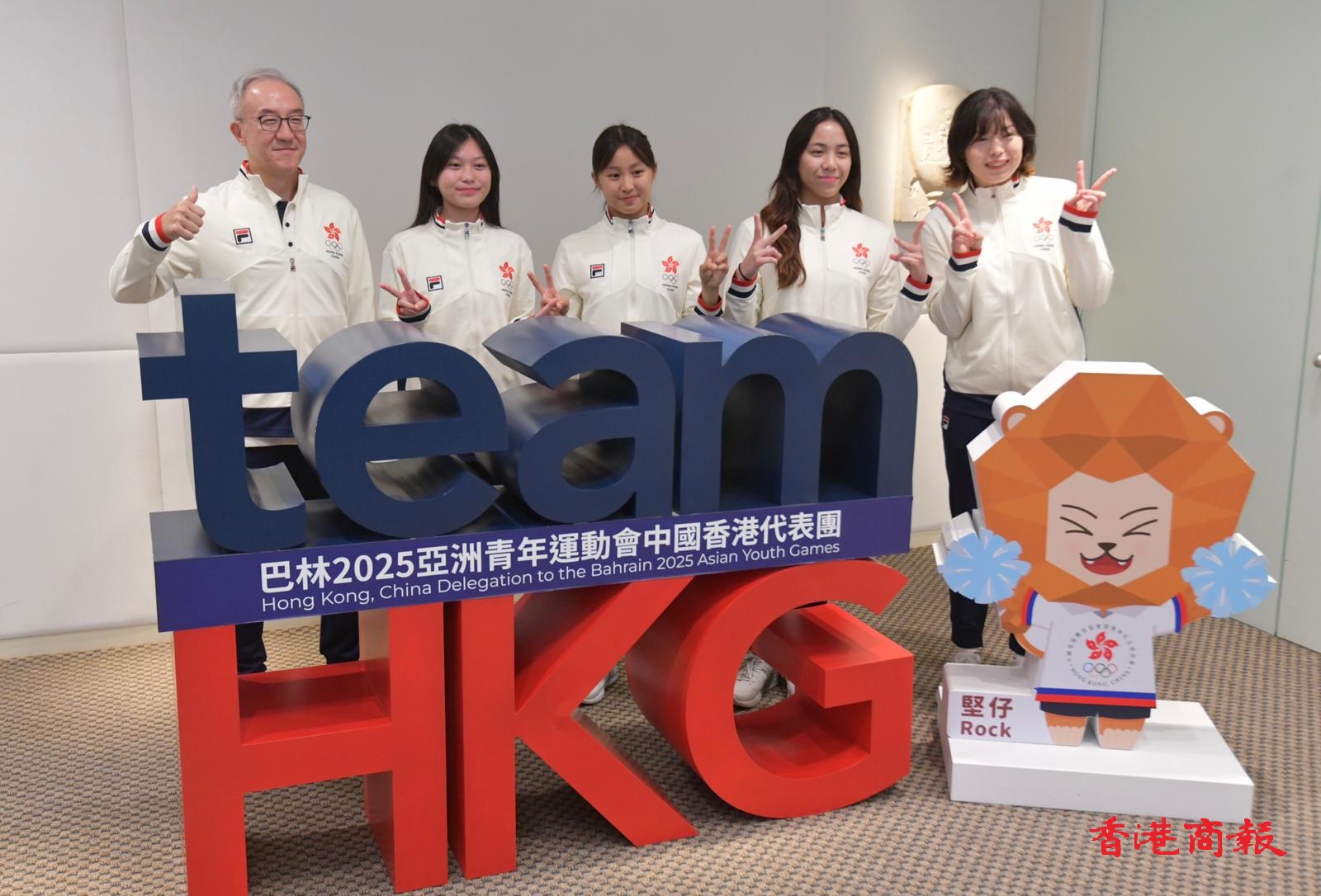 巴林2025亞洲青年運動會中國香港代表團團長莫君逸與4位參賽運動員合照。記者 崔俊良攝