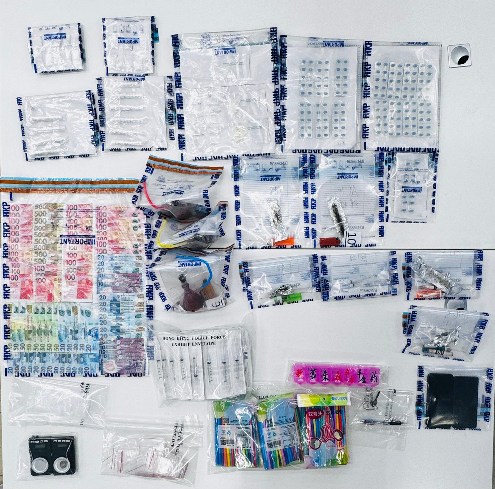 行動中,警方檢獲約71.6克懷疑海洛英、約23.9克懷疑冰毒、約18克懷疑氯胺酮、約263克懷疑霹靂可卡因、約23.7克懷疑可卡因、199粒「藍精靈」、49粒懷疑依托咪酯煙彈及一批懷疑吸食毒品工具,包括冰壺、錫紙及打火機等,總市值約36萬元。(記者區天海)
