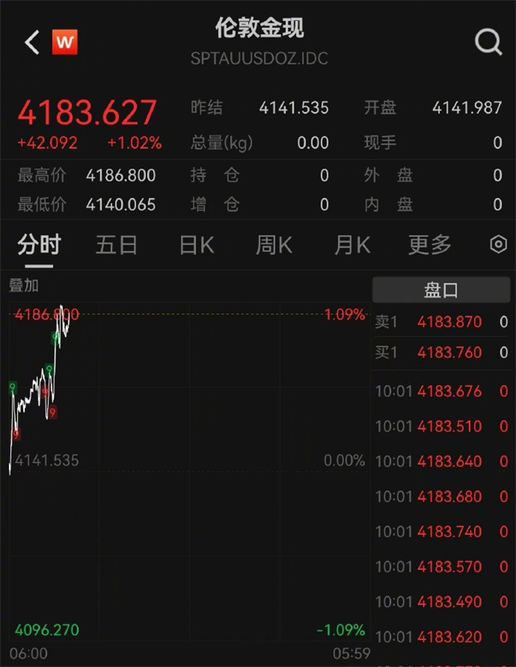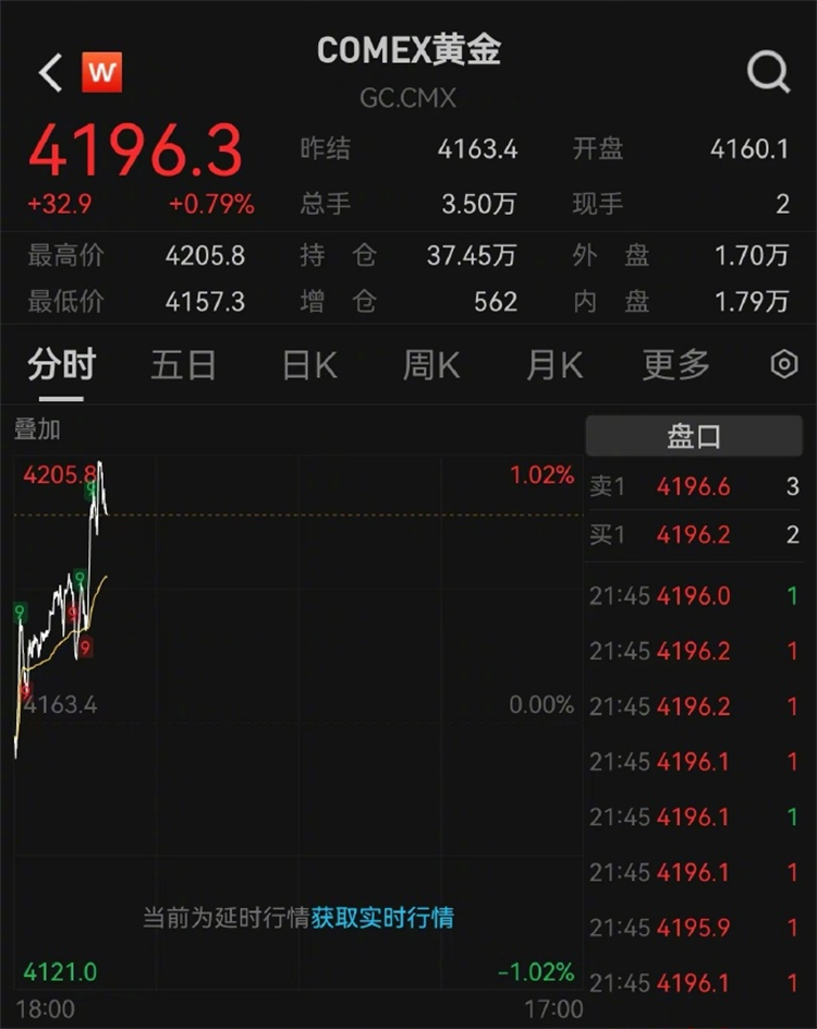 10月15日,國際黃金再創歷史新高。截至10時,COMEX黃金突破4200美元/盎司大關,最高觸及4205.8美元/盎司,最大漲幅1.02%;倫敦現貨黃金突破4180美元關口,最高觸及4186.8美元/盎司,最高漲幅1.09%。