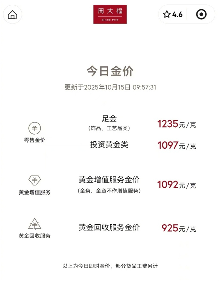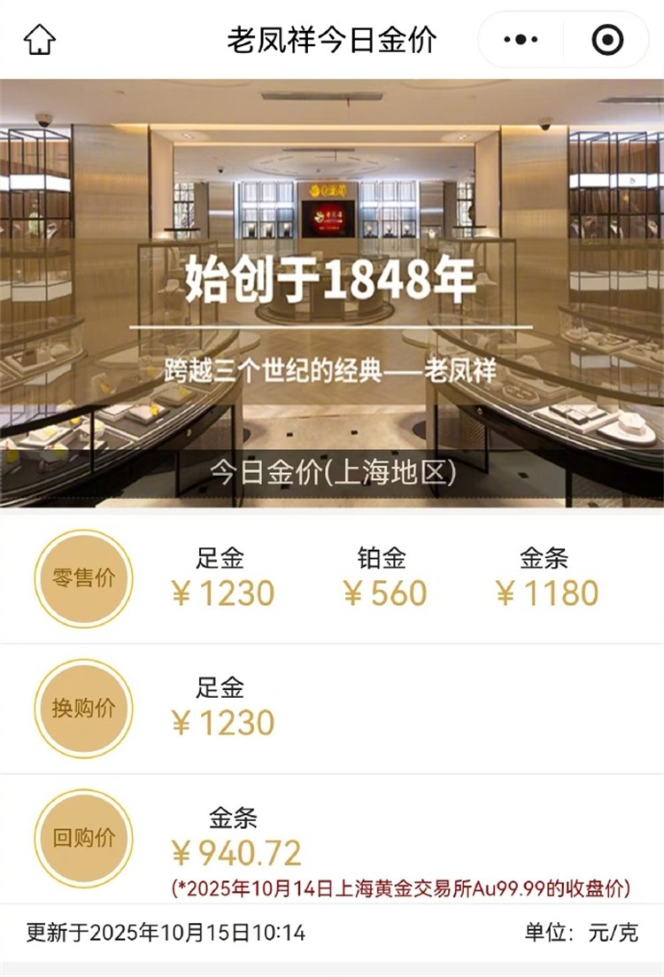 受金價上漲影響,15日國內金飾克價繼續上調,周大福足金首飾價格由前日的1215元/克上漲至1235元/克,一夜大漲20元;周生生足金首飾價格由前日的1213元/克上漲至1227元/克,一夜大漲14元;老鳳祥足金首飾價格由前日的1206元/克上漲至1230元/克,一夜大漲24元。