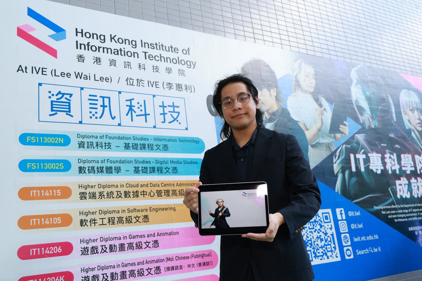 HKIIT 遊戲及動畫高級文憑(動畫)二年級學生蔡旻叡(Anson),自小是「機迷」,愛看動漫和畫畫,屋內擺滿動漫模型,他甚至會自學動漫風繪圖技巧,親手為家人和朋友繪畫生日賀卡。Anson曾試玩「AI照相館」,他指以往動畫師製作一個遊戲角色需時數天,但利用AI科技生成僅花上一分鐘,可降低製作成本和省卻繁瑣的設計流程。但他認為AI僅為工具,不能來取代創作者,動畫設計師更需裝備自己相關編程技能以開發AI軟件,利用AI提升作品質素和探索新的動畫呈現方式。