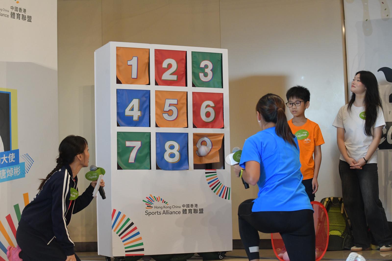 黃卓寧和唐焯彬,其後和參與活動的小朋友組隊比賽,挑戰九宮格,他們需要將球體投擲到格內,愈高分為之勝出,眾人都相當投入,活動在一片歡呼聲中結束。(記者 葉家亨/攝影 崔俊良)