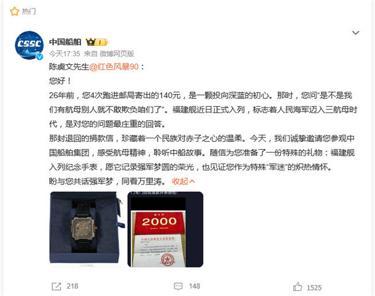 11月10日,@中國船舶 在微博發文:「26年前,您4次跑進郵局寄出的140元,是一顆投向深藍的初心。福建艦近日正式入列,標誌着人民海軍邁入三航母時代。我們誠摯邀請您參觀中國船舶集團,感受航母精神,聆聽中船故事。隨信為您準備了一份特殊的禮物:福建艦入列紀念手表,願它記錄強軍夢圓的榮光,也見證您作為特殊『軍迷』的熾熱情懷。」(圖片截自微博)