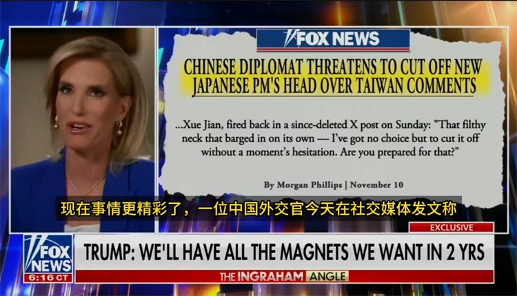 當地時間11月10日,美國總統特朗普在接受福克斯新聞採訪時,主持人提問:日本新任首相高市早苗稱,「台海局勢目前處於極其嚴峻的階段」,他們可能會將中國大陸對台灣地區的任何舉動視為日本的「生死存亡危機」;一位中國外交官今日在社交媒體發帖提及「斬首」,先生,這些中國人不是我們的朋友,對嗎?