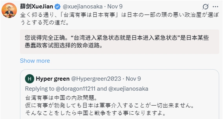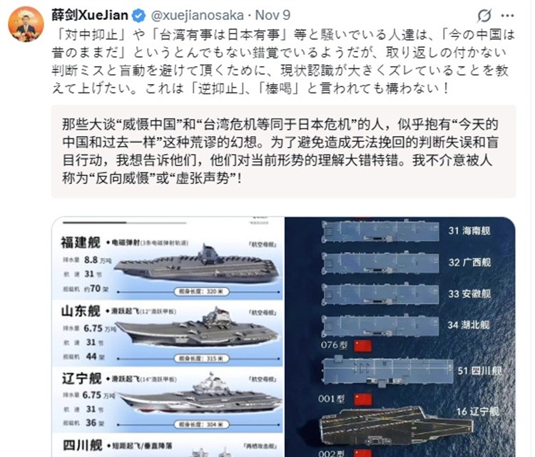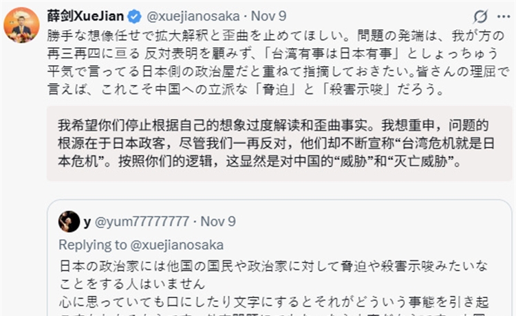 近日,中國駐大阪總領事薛劍多次回擊日本涉台海問題言論。(截自X)