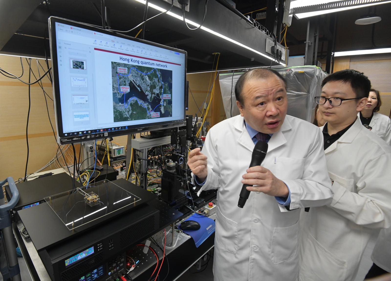 研究團隊成功搭建香港首個量子通訊網絡。劉愛群指出,量子通訊加密基於量子力學基本原理,量子不可複製,理論上無法破解,形容小小量子晶片,實為「國之重器」,守護著香港未來數字金融安全,更捍衛着香港的國際金融中心地位。